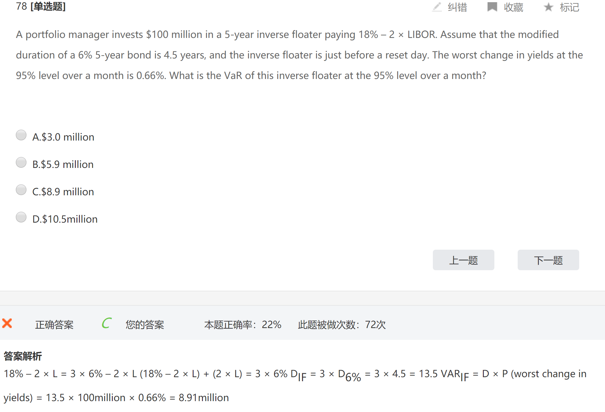 反向浮动利率,书上没有。这是通过构造的方法计算。 设floating的面值为x,inverse floating的面值为y 则 x+y=100以及x*Libor+(18-2*Libor)y=100*6% 显然x=2y,y=100/3 又floating的D=0,所以 x*0+y*D(if)=100*4.5 所以y=13.5