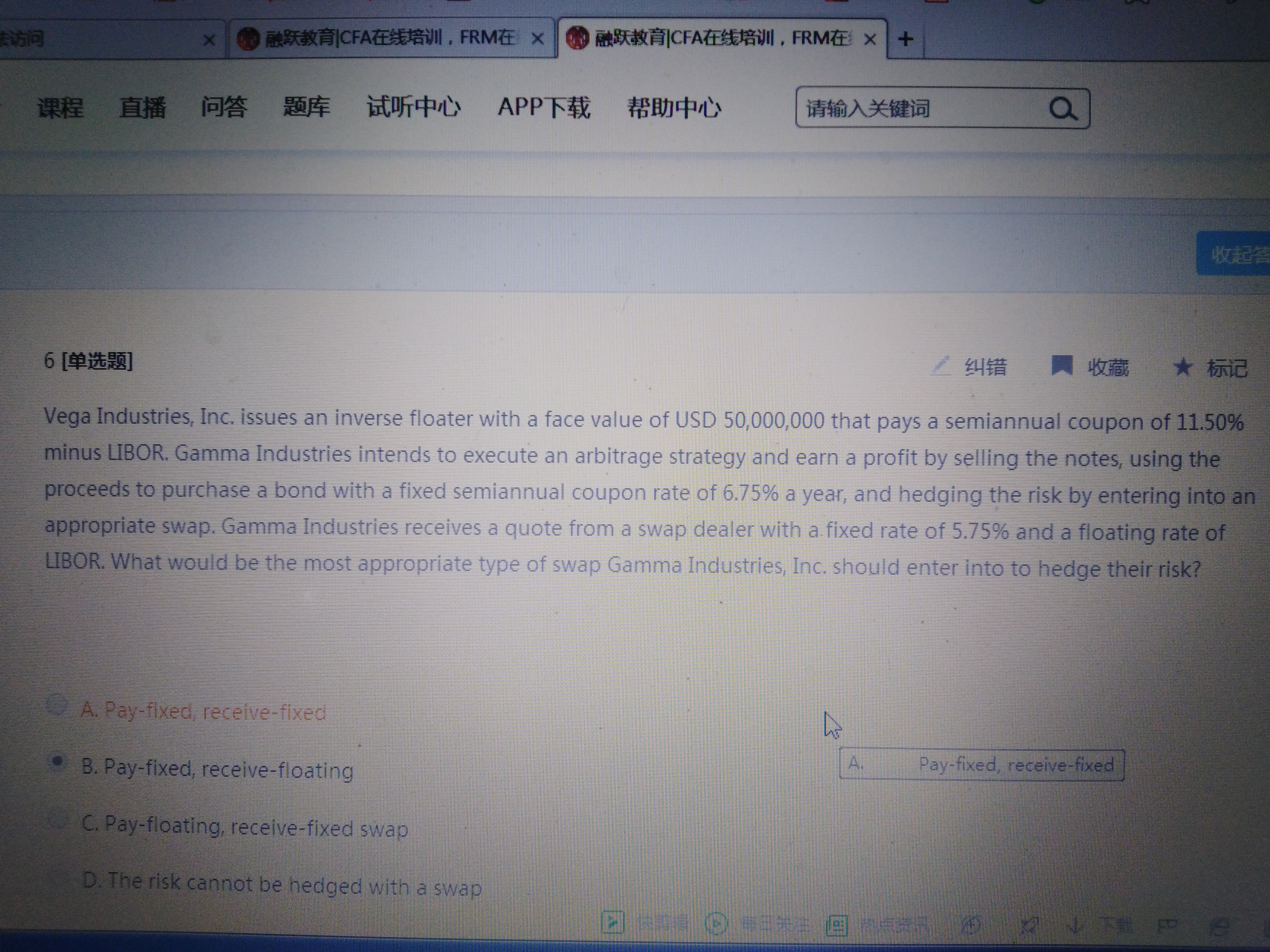 发行并卖出inverse float bond,收浮动之固定,对冲风险的话就是支浮动收固定。所以选C
