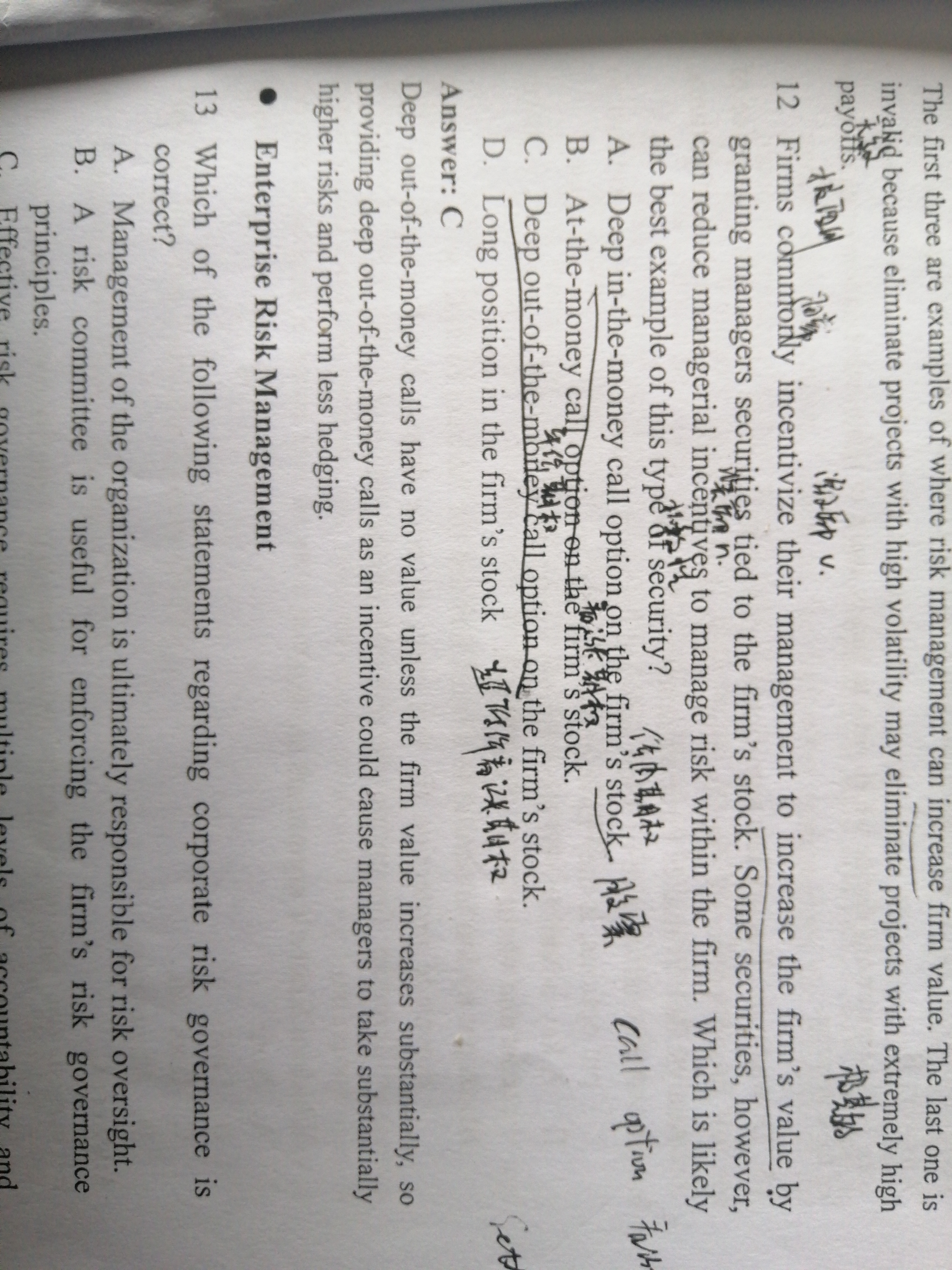 题目问的是给管理层股权激励,哪一种激励方式会致使负面效果?C选项会让管理层冒险。