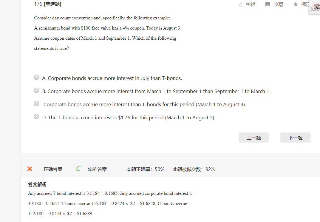 同学,不同bond计算应计利息的天数是不一样的,在书上有详细的介绍,应该是在第三本书应计利息那里有详细的讲解,day count,课件有