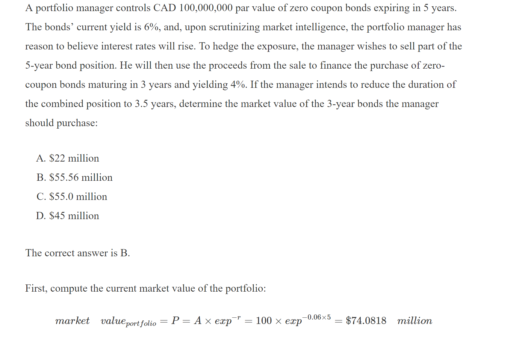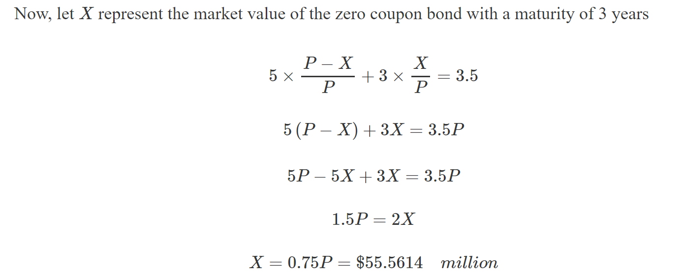 因为担心市场利率上涨,所以卖出5年的bond,再买进3年的bond.期望吧组合的久期降到3.5.组合久期的计算方法是单个资产久期的加权平均,通过这个方法来得到3年bond的价格。这个是整道题的思路。同学你哪里不懂?