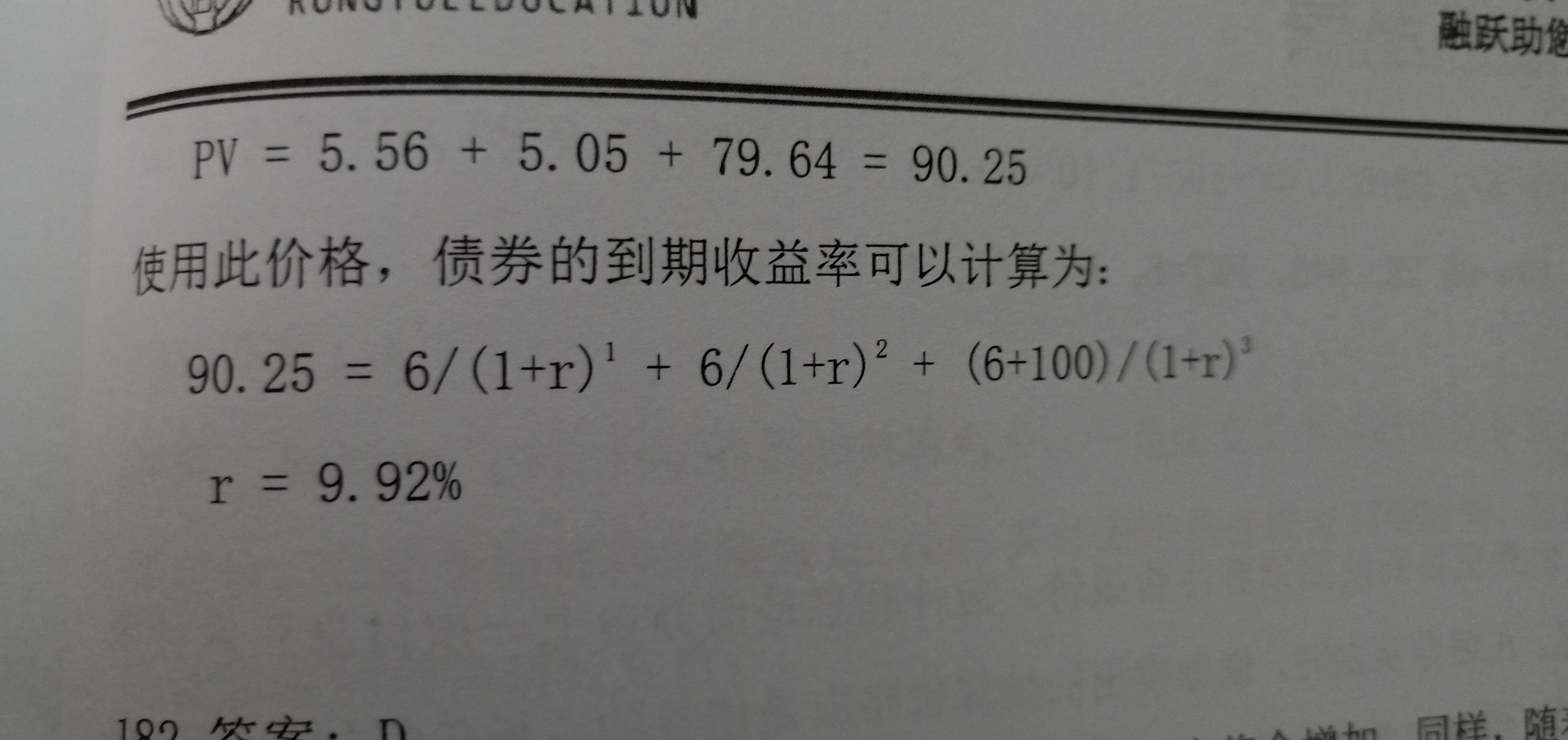 用金融计算器上的五个建就可以算,PV=90.25, FV=100,N=3 PMT=6,求I/Y