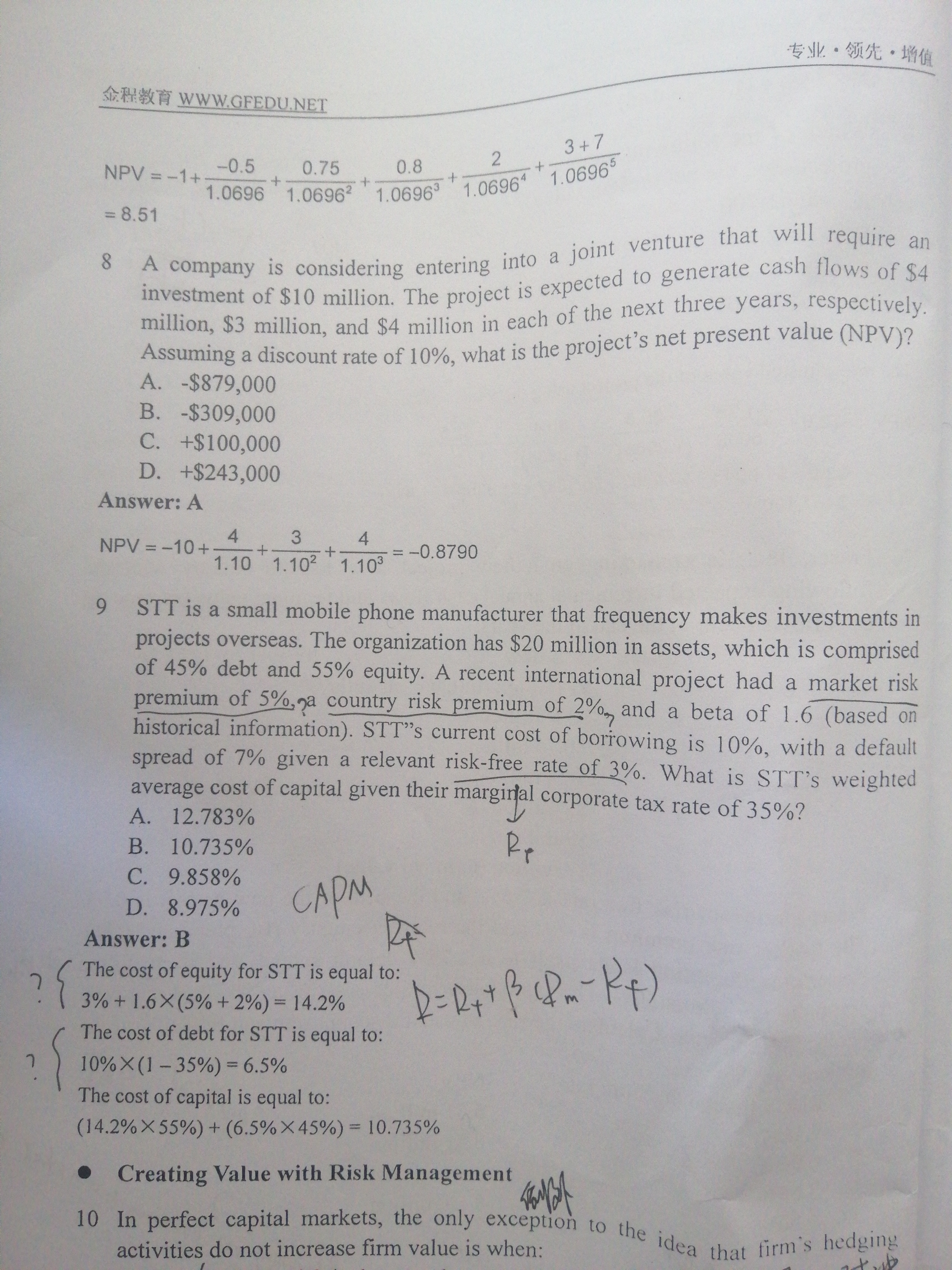 同学,资金成本是否是股权融资成本加上债权融资成本,体现在最后一行。股权融资成本是CAPM模型,但是题目给的market risk premium和country risk premium啊,已经减过无风险利率了,你套用capm模型的时候,括号里不能再减无风险利率了。