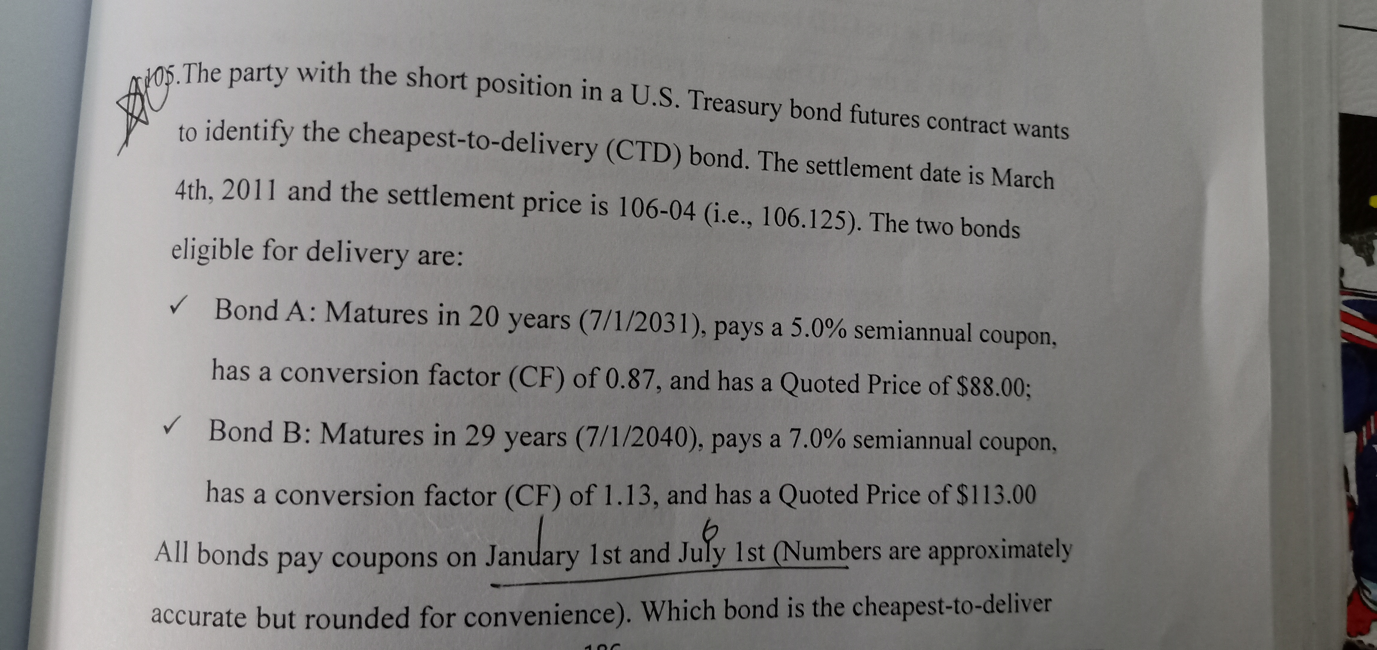 1、根据下图公式算出,A的cost of delivery-4320,B的cost of delivery -6921,根据ctd原则,数越小就越有利,则应该是bond B,cost -6921,即盈利6921 2、其余的像到期日啥的不用管 3、只有short position才会有ctd需求