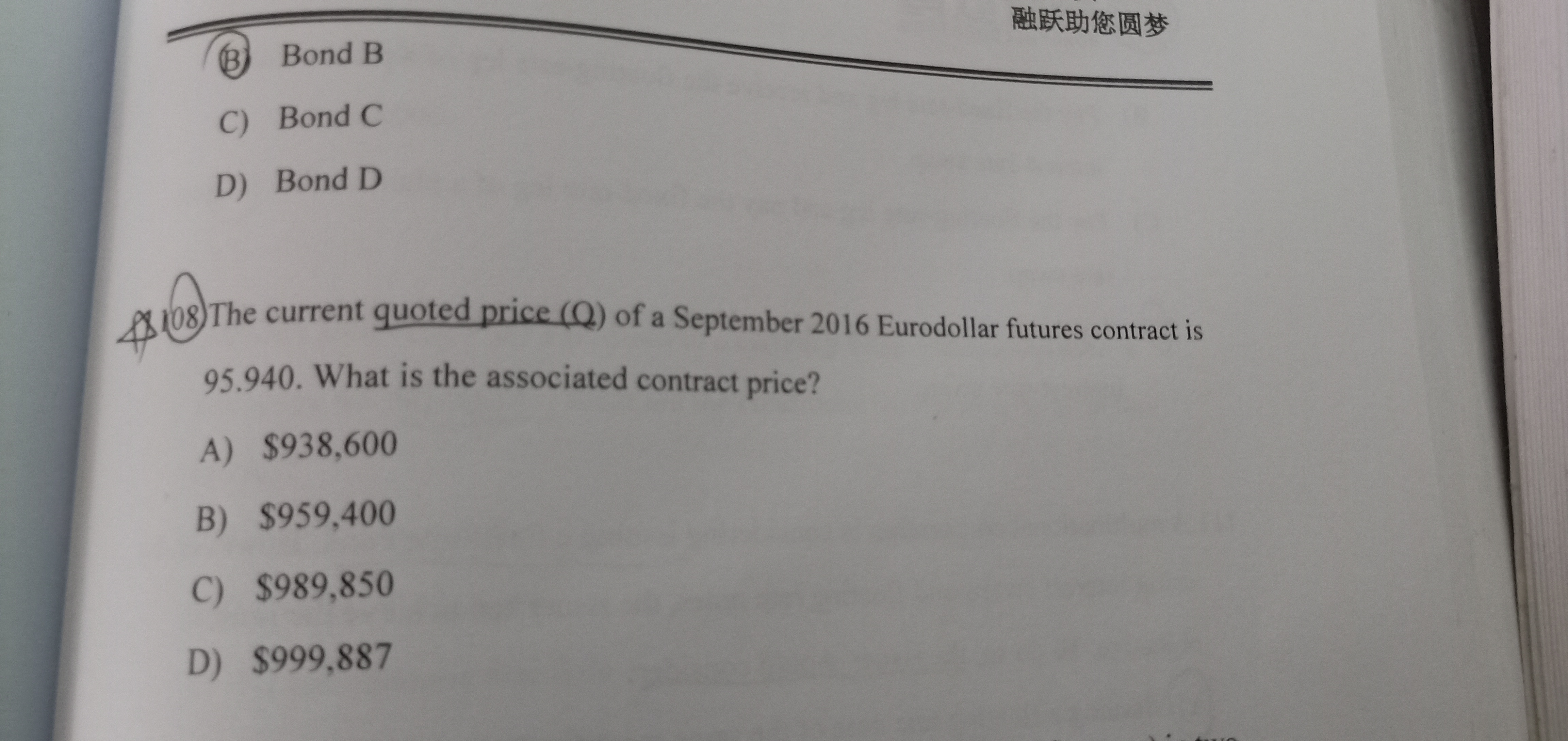 95是以100为面值报价的,要转化为以1为面值报价,所以需要95/100.欧洲美元期货一份是1million,所以要再乘以1million,选B。