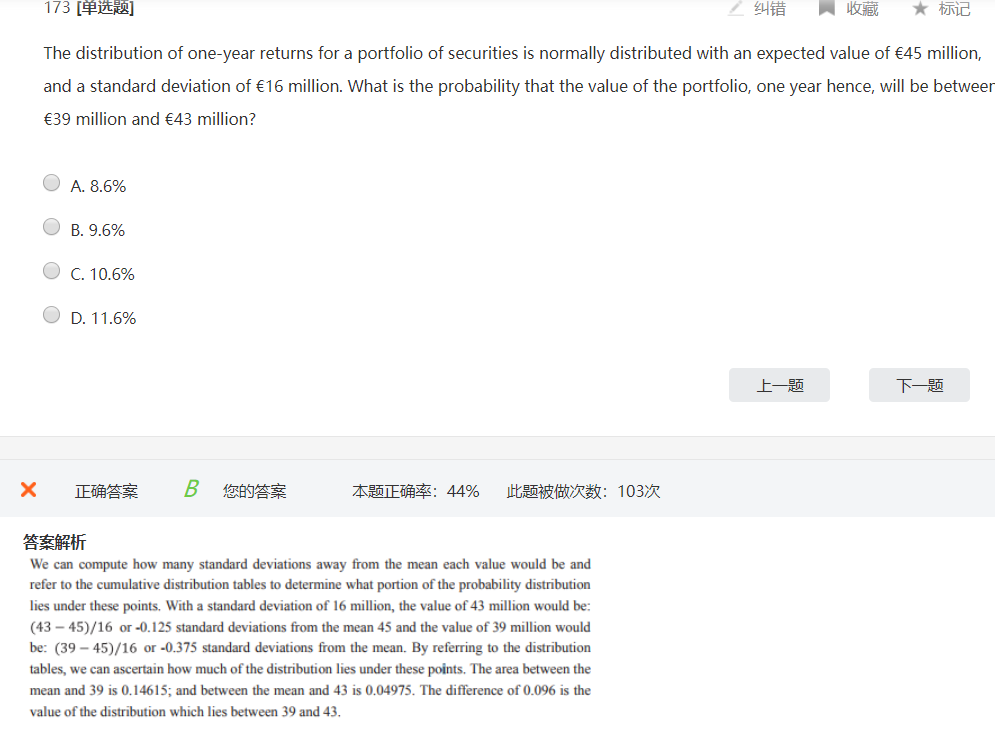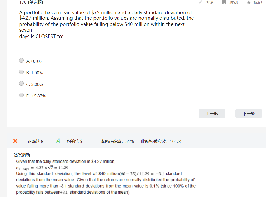 第一张图,P(-0.125)-P(-0.375)=P(0.375)-P(0.125),查表,就是在正态分布表中找到对应数据就可以了。 第二张图,不是除以,是乘以,这是平方根法则,将一天的var(sigma)转化为n天的var(sigma)就需要乘以根号,这是公式推到的,你可以不用管,但是精讲班里老师有讲的。 第三张图,你记住这两种说法。