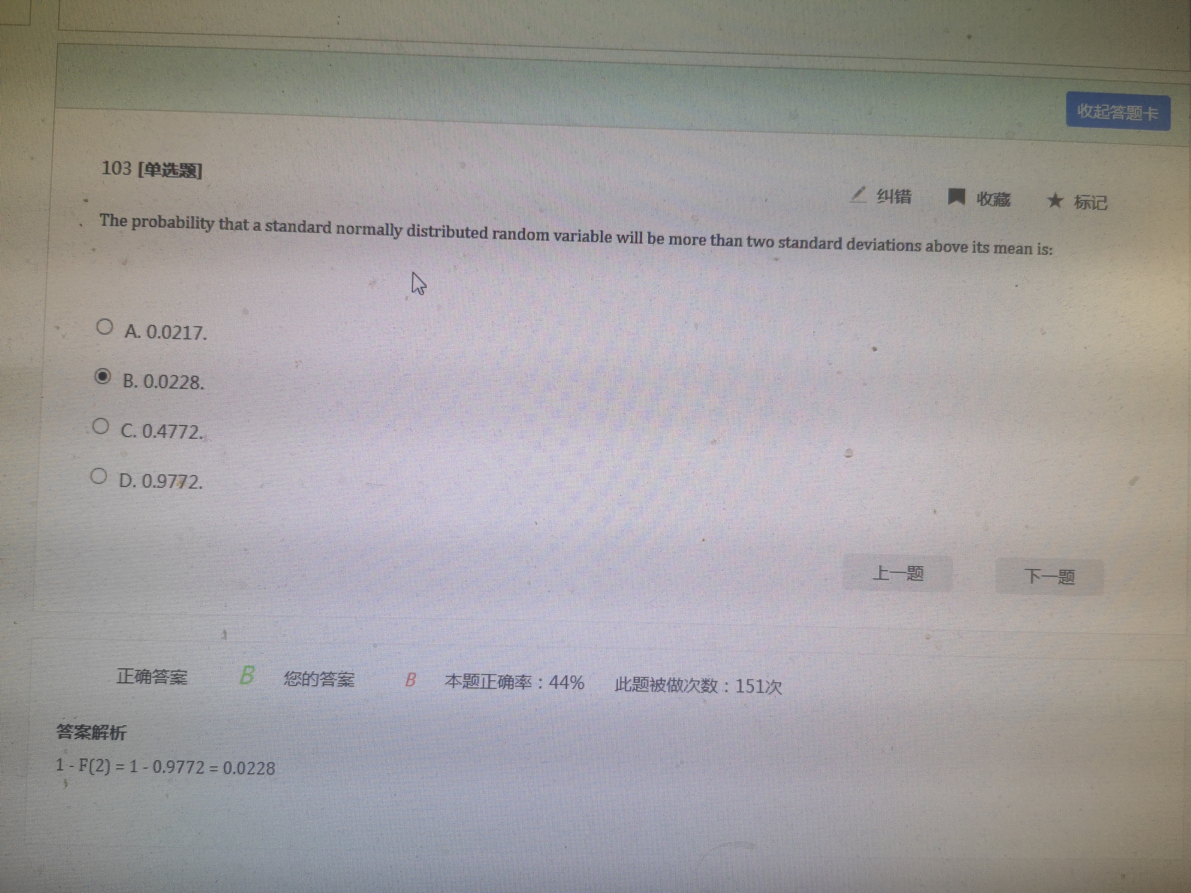 在正太分布中,mean+2sigma这个数据点右边的概率是多少? 在标准正太分布中,就是解析里写的1-F(2),查表就可以求出来的。