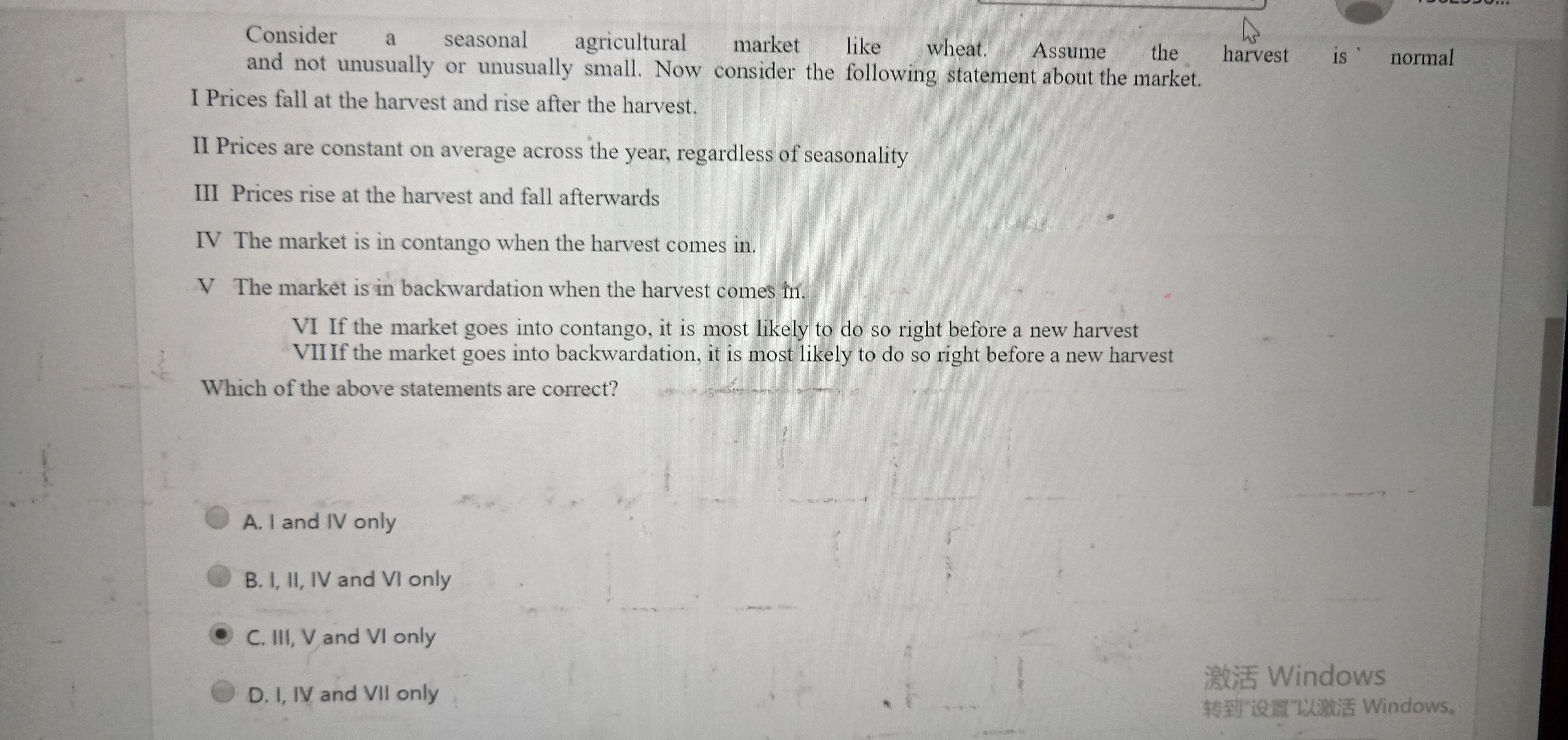 147是对的啊,现货价格在丰收的时候是下跌的,丰收之后开始逐渐上涨,远期的价格高于即期价格,所以是正向市场。同学你哪里不理解?