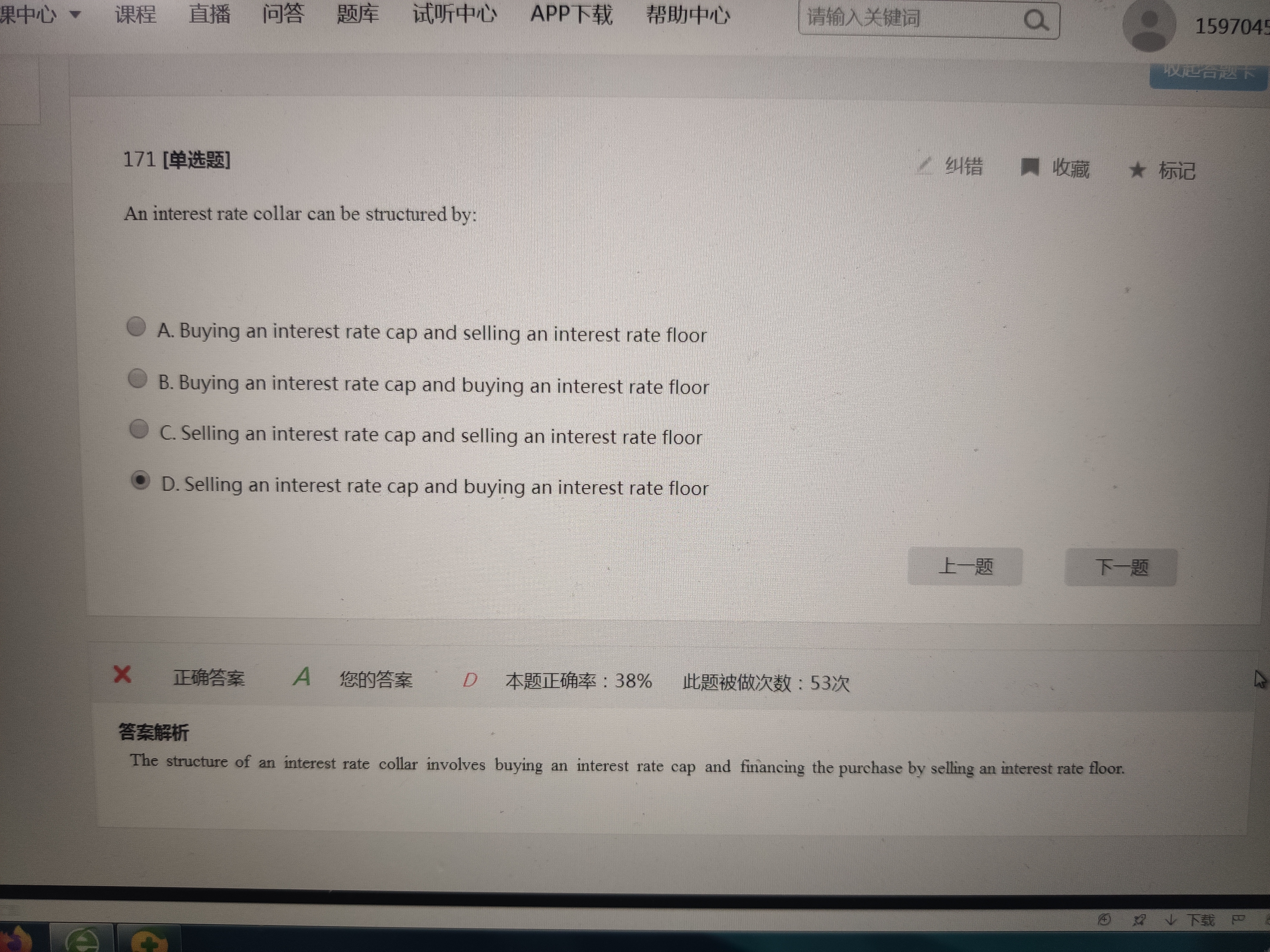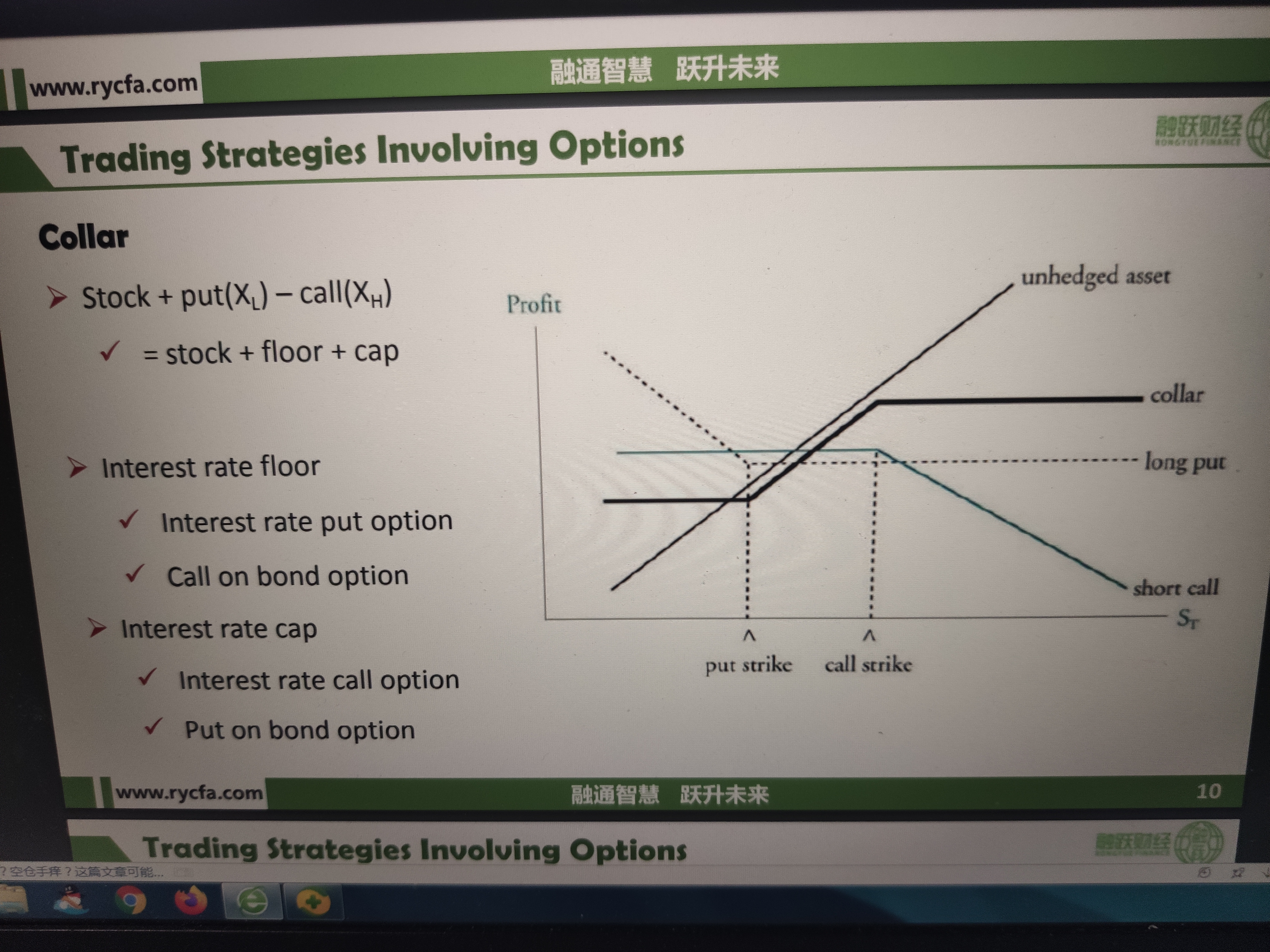 利率两头封(Interest Rate Collar)又称“利率上下限”,是将利率封顶和利率封底两种金融工具合成的产品。具体地说,购买一项利率两头封,就是在买进一项利率封顶的同时,卖出一项利率封底,以收入的期权费来部分抵销需要支出的期权费,达到既规避利率风险又降低费用成本的目的。卖出一项利率两头封,则是指在卖出一项利率封顶的同时,买入一项利率封底。当借款人预计市场利率会上涨时,可以考虑购买一项利率两头封。 看下这个定义,就其实a和d都表示collar,只是a代表long collar,d代表short collar