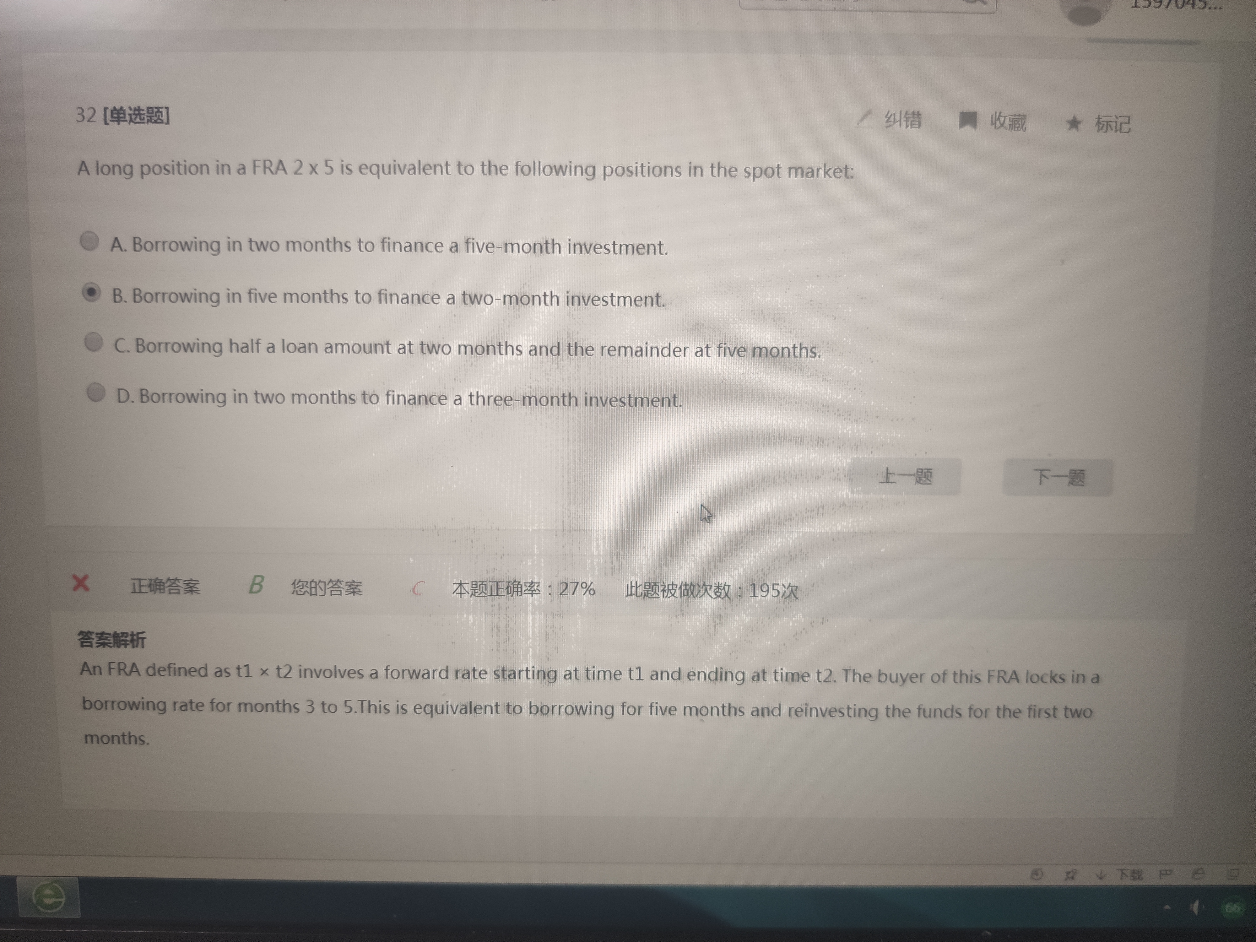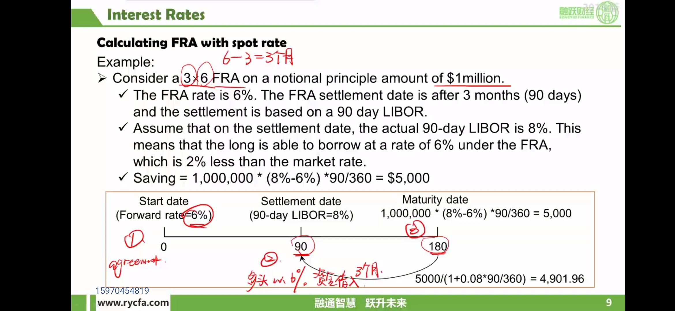 以固定利率借入5个月,再投资最初的两个月。这个构造不太好理解。 例题说的是以6%借入6个月,再投资期初的三个月,这样FRA的价值就是在后面的三个月中剩下的利息。