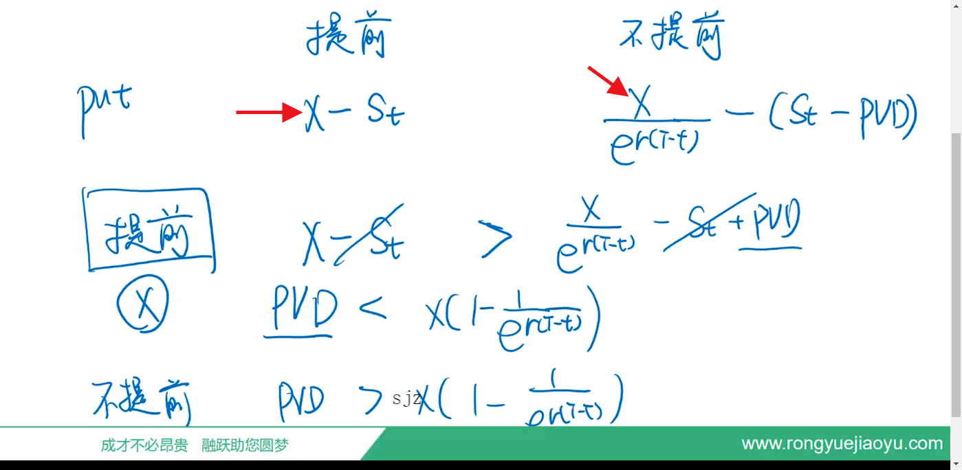 约定的执行价格是不变的,比如说约定的执行价格是30.如果是一年到期,那到期执行的时候支付30元,这30元在今天是值30e^(-rt)的,但是如果提前执行,在今天支付30元,这30元字今天的价值是30元。
