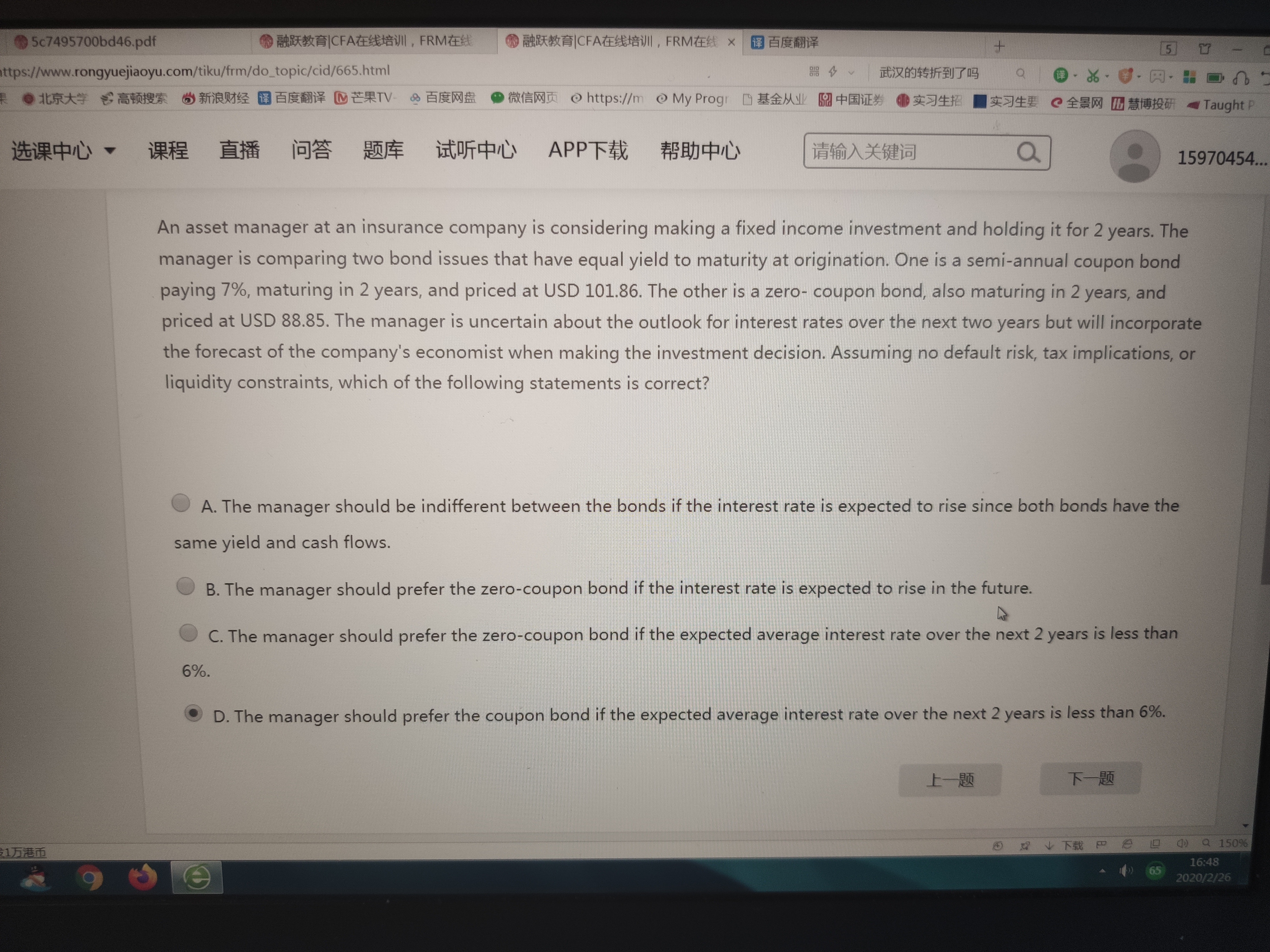 你算错了,都是6%。需要根据未来的利率走向来判断选coupon bond或者zero bond。如果未来的利率高于6%,投资者买coupon bond 获得期间现金流可以获得高的再投资收益,如果未来的利率低于6%,那倾向于零息债。