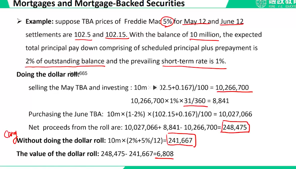 第一个,dollar roll是同时决定买卖,现在就决定一个月后再买回来,不是同时买卖。 第二个提前偿付给你的,你就收到现金了,是加上不是减去。