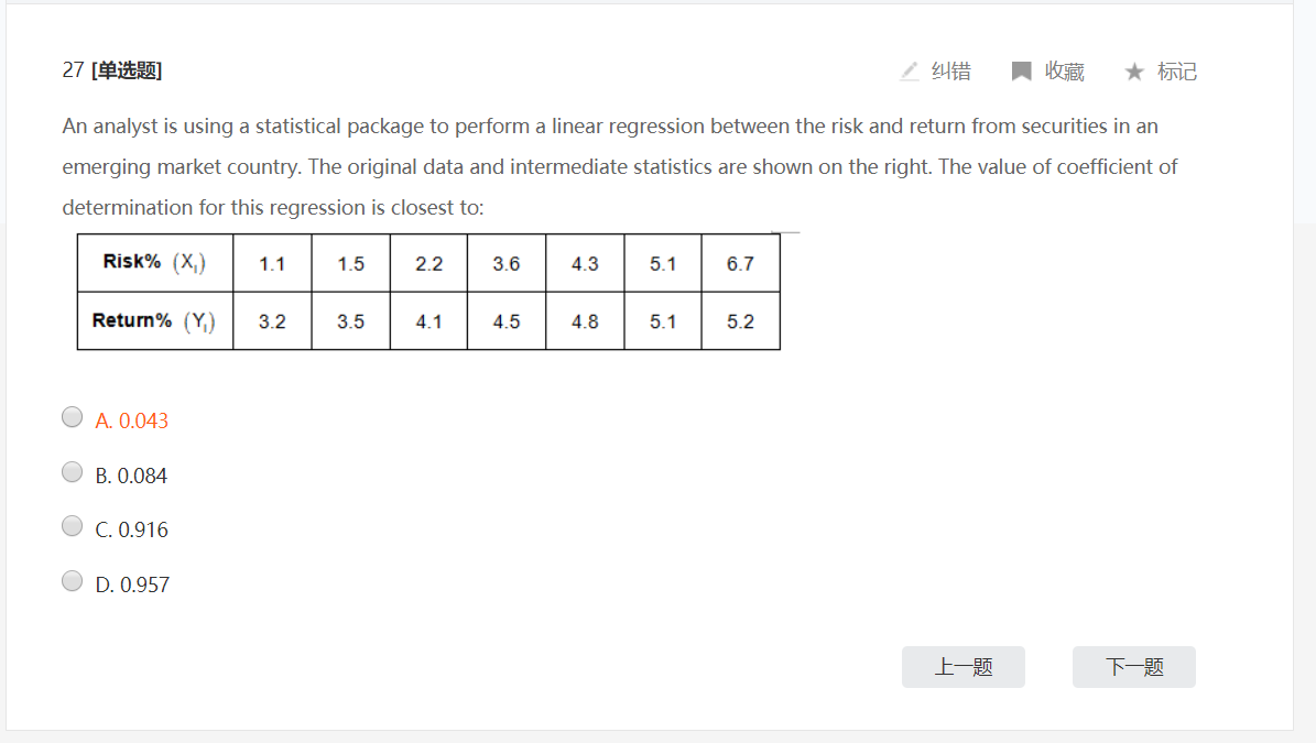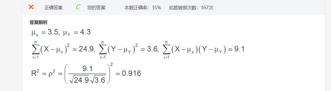 这道题的公式是不是用错了?simple linear regression对coefficient的公式不是应该是最下面我圈起来的那个公式吗?如果是求correlation的话,在算standard deviation和covariance的时候因为这里是算的sample standard deviation和sample covariance不是应该都在原有的公式下除以一个n-1吗?