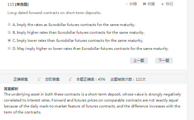 同学,这道题的关键问的不是forward和futures价格谁大谁小的问题,而是问forward和futures隐含的利率谁大谁小的关系,因为MTM的原因,forward价格要比futures高,同时forward和futures价格和利率成负相关关系,所以它们对应的隐含利率就是futures隐含的利率大于foward隐含的利率。