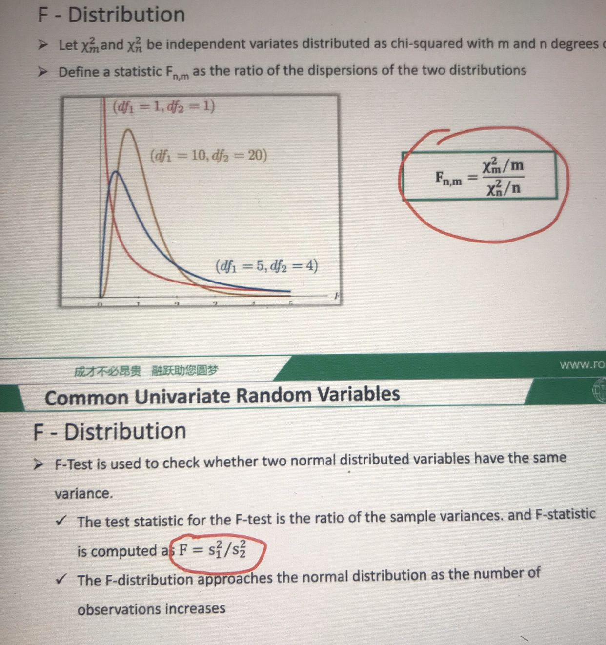 同学,你好! 第一个公式是F分布的定义式,是指这个分布是如何定义出来的。 第二个公式是F检验统计量公式,它是经过复杂证明的,统计量服从F分布后,才命名为F检验统计量的。证明过程复杂,不要求掌握,我们只需要知道F检验统计量服从F分布这个结论以及哪些哪些情况下会用到F检验统计量(1.两个正态总体方差的检验。2.多元线性回归的联合假设检验)就可以了。