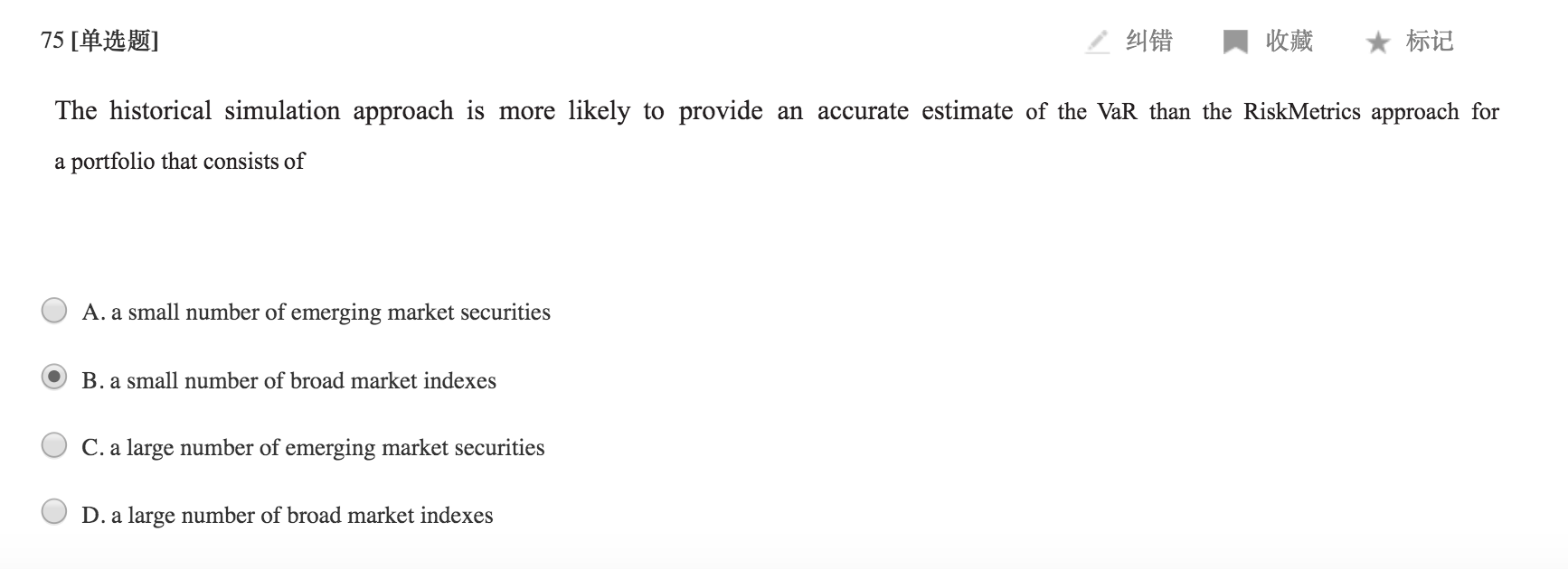 risk metrics 法要求样本数据服从正态分布,同等情况下,大样本比小样本数据更有可能服从正态分布,也就排除了C和D,广泛的市场的指数比新兴市场的指数更有可能服从正态分布,所以排除B,所以最终选A
