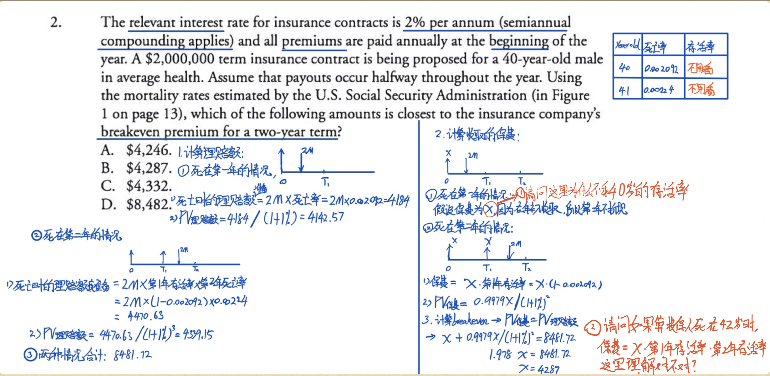 第一年死的话,保费是X,不需要乘以存活率,因为你已经假定他死了。 第二年死的话,保费是X乘以第一年的存活率,不需要乘以第二年的存活率。