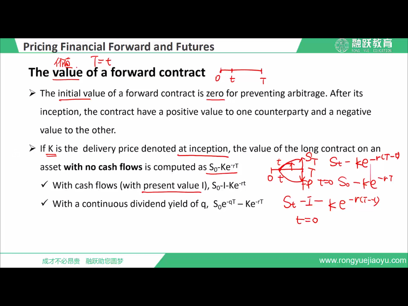 forward 的执行价格K是Se^rt. forward 的价值是Se^rt - K,也是到期的利润. 在起初的时候S0 - K^(-rt),等于零才不会有套利机会。S0 是起初的市场价格。