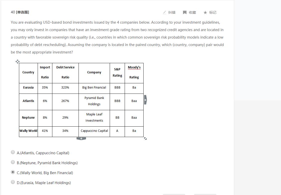 BBB以上为投资级,排除第三个,主权风险要小,相比第一个和第二个(债务比率高),第四个更好。