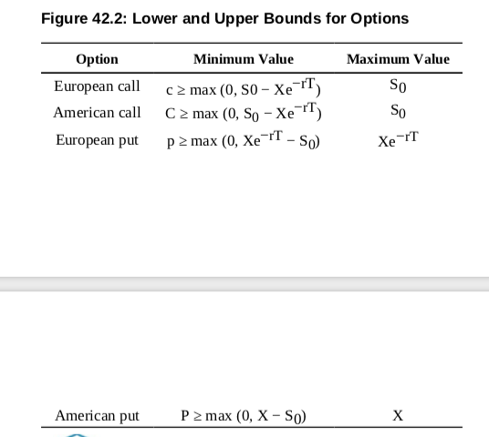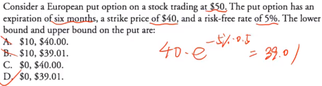 对于put来说,当underlying价格降到0的时候,put价值最高,也就是行权价的现值,即答案中的39.01,而最小值就是不行权,0