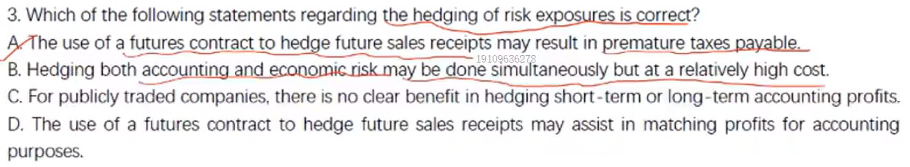 同学你好,对于A选项,一般情况下,期货合约不反映在资产负债表中,所以就不会导致过早导致应纳税科目,所以A选项是错的;对于B选项,经济风险和会计风险一般不能同时对冲,因为会计风险大多数是短期的,表内的,而经济风险大多是长期的,对应的是公司的整体,所以B选项是错的;对于C选项,对冲工具的使用可以降低上市公司收入的波动性,从而稳定市场预期,对公司的经营有很大益处,所以上市公司是有动机去做对冲的。所以C选项是错的,对于D选项,利用期货合约等对冲工具可以对冲掉收入的的波动性,从而降低利润的波动性,这样报表就会好看,所以D选项是对的。