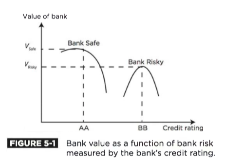这里的评级主要指的是银行投资目标业务的评级,低的业务评级也就意味着高风险,同时要求的回报率也比较高,这里其实就是银行价值与银行信用评级的一个关系,银行如果吸纳很多的存款,如果拿来做业务的部分很少都是稳定收入,这样银行价值会降低;如果大部分的钱都拿出来做业务,这样又会导致银行承担风险比较高,违约概率比较大,同样会导致银行价值降低,所以有一个平衡点,在这个地方银行承担一定的风险,价值最高,同学可参考下面图片中的图进行理解。