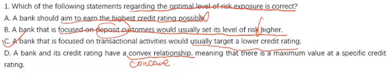 这里其实就是银行价值与银行信用评级的一个关系,其实很好理解,银行如果吸纳很多的存款,如果拿来做业务的部分很少都是稳定收入,这样银行价值会降低;如果大部分的钱都拿出来做业务,这样又会导致银行承担风险比较高,违约概率比较大,同样会导致银行价值降低,所以有一个平衡点,在这个地方银行承担一定的风险,价值最高;图片如下