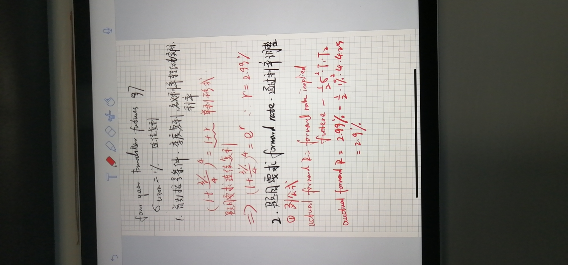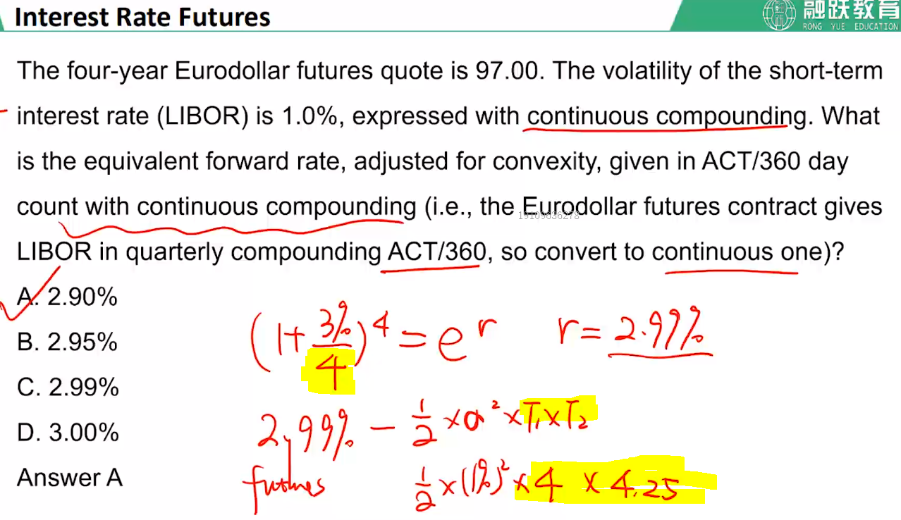 这个题目首先,利率百分之3%是因为LIBOR报价方式,LIBOR = 100 - quoted price,也就是这里100-97就是libor 3%;第一个问题 除以4是因为名义利率是按照季度复利的,所以要转化为实际利率;第二个问题是因为T1 等于4是题目说了是4年的期货合约,4.25是因为eurodollar 是3个月到期,所以期限变成了4.25年;后面就是带公式了