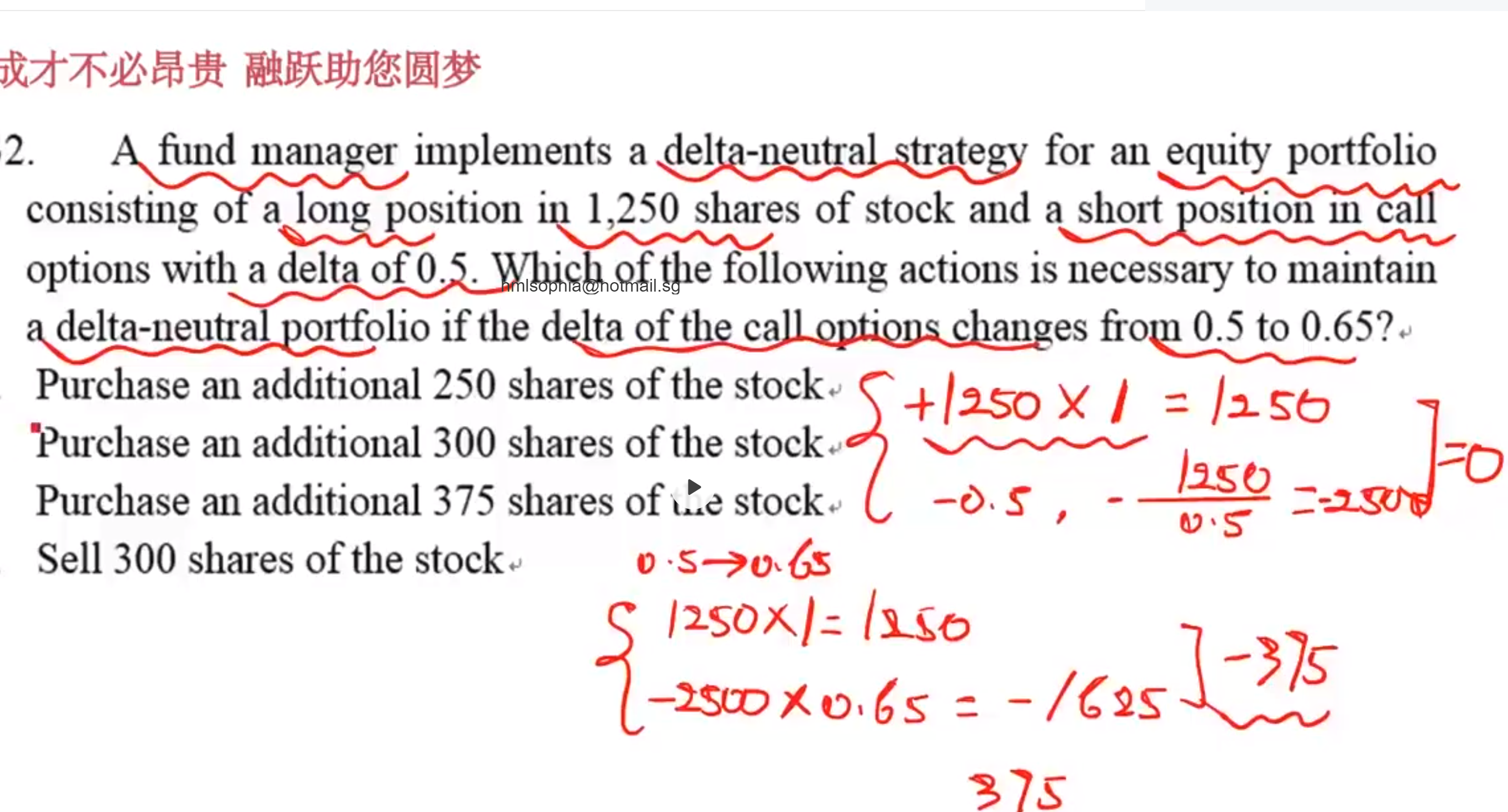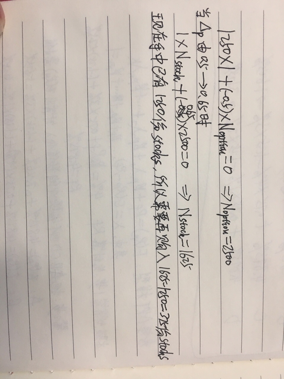 同学你好,这道题考察的是delta对冲的计算,基本公式是:股票的数量*1(因为股票的delta=1)+期权的数量(买入为正号,卖出为负号)*期权的delta=0,本题详细解答见图片
