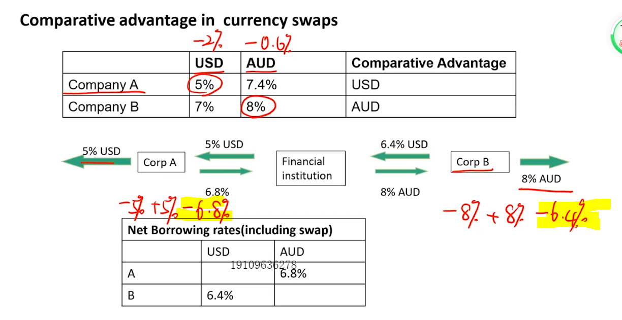 通过互换能节约的总成本是1.7,除去中间机费用0.2.剩下1.2平均分摊到双方头上,每个人能节约0.6啊。所以就是7.4%-0.6%=6.8%。,7%-0.6%=6.4%。 第二个问题,因为B会给他补偿的。 你仔细看一下我给的那张图。