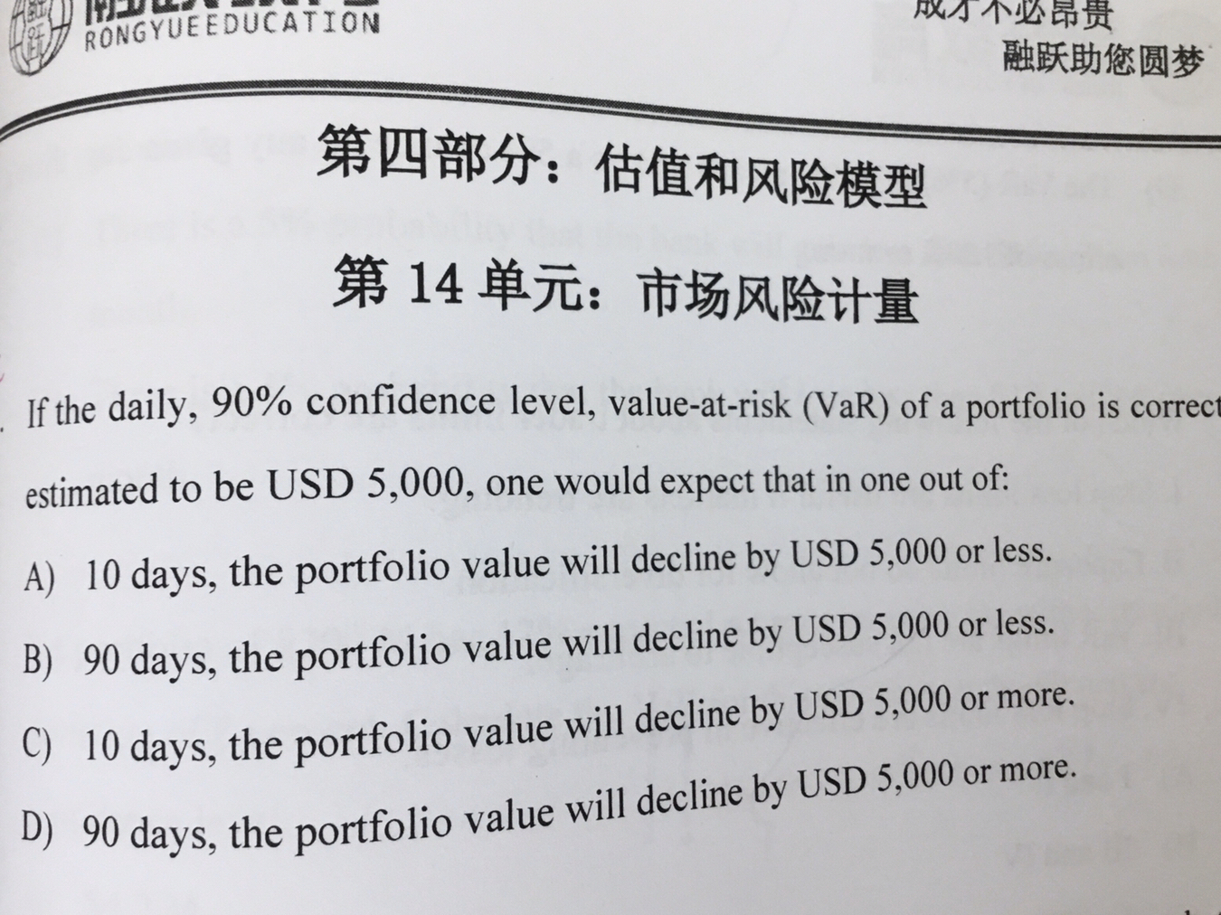 有十分之一的可能性,十天中有一天价格下降的超过5000,就是说十天中有一天的概率损失会超过5000,这是var的概念。