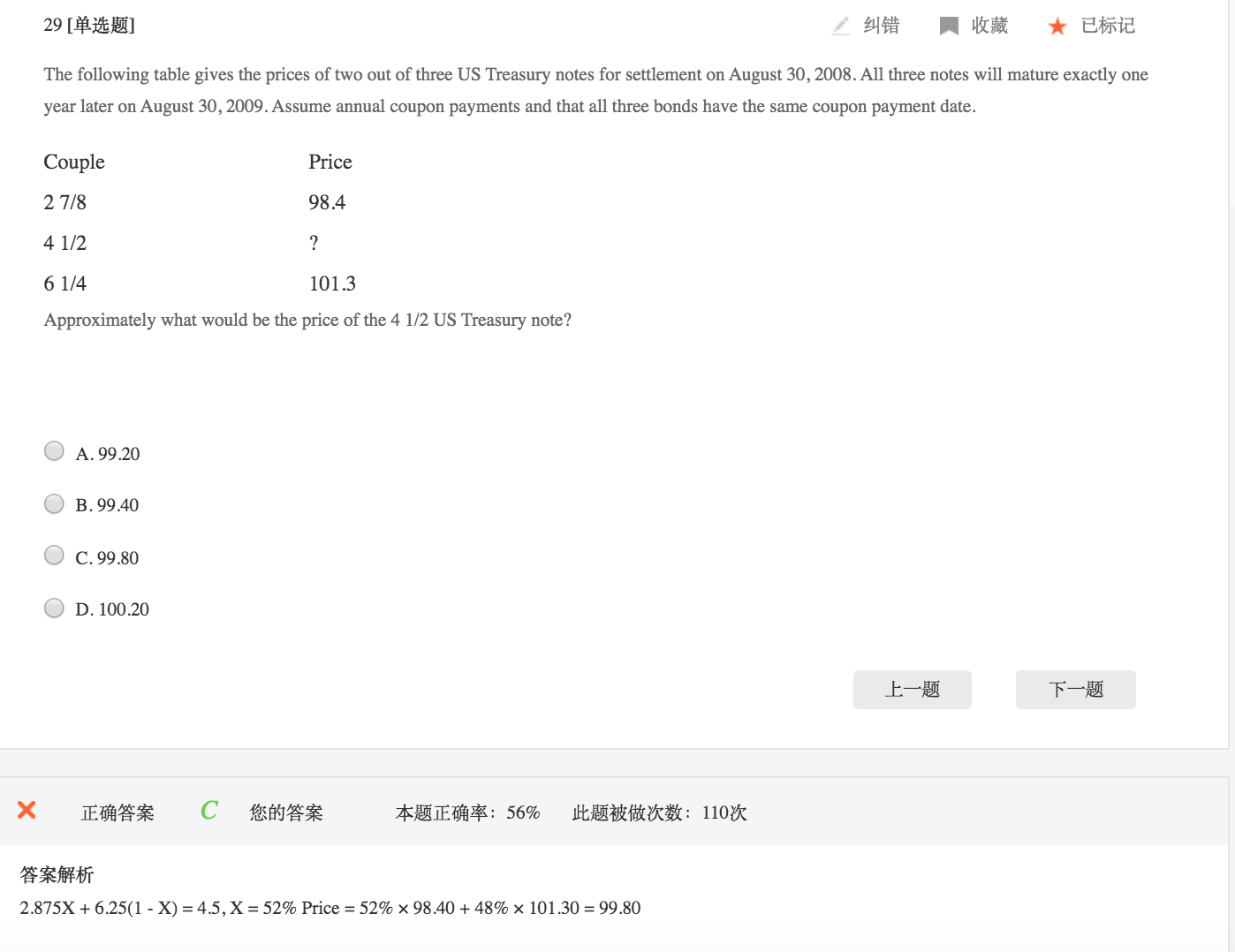 这道题考察的是付息债券的复制,主要是使用现金流匹配法计算。详细答案看图片,不用纠结题目中给的答案,上面写的不是很清晰。