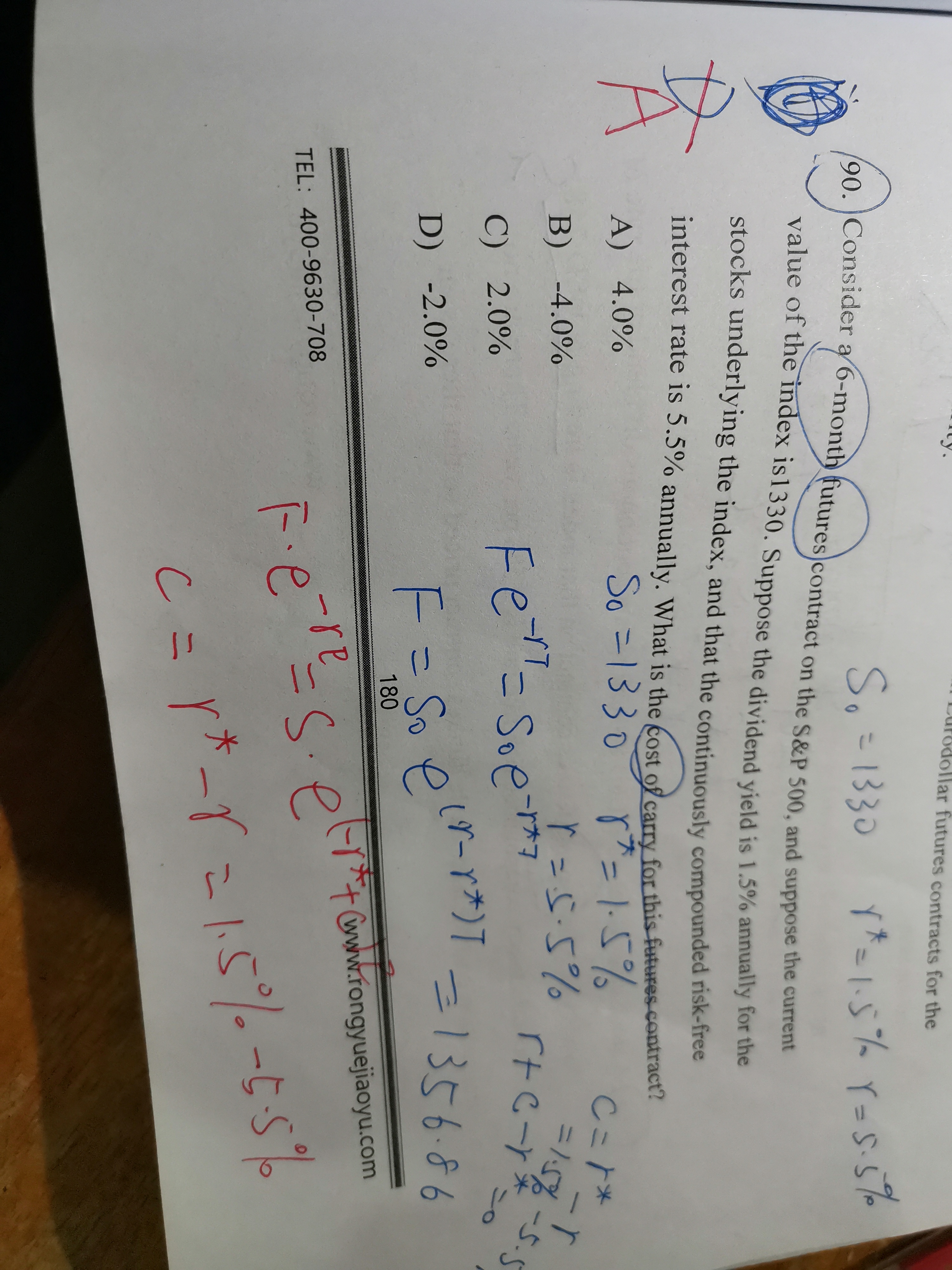 这道题问的是持有该期货合约的成本是多少,根据期货定价公式加成本减收益原则和连续复利计算公式,即1.5%(股息率即收益)-5.5%(无风险利率即成本)=-4%,可以得出该期货合约的净成本为4%,负号代表成本。