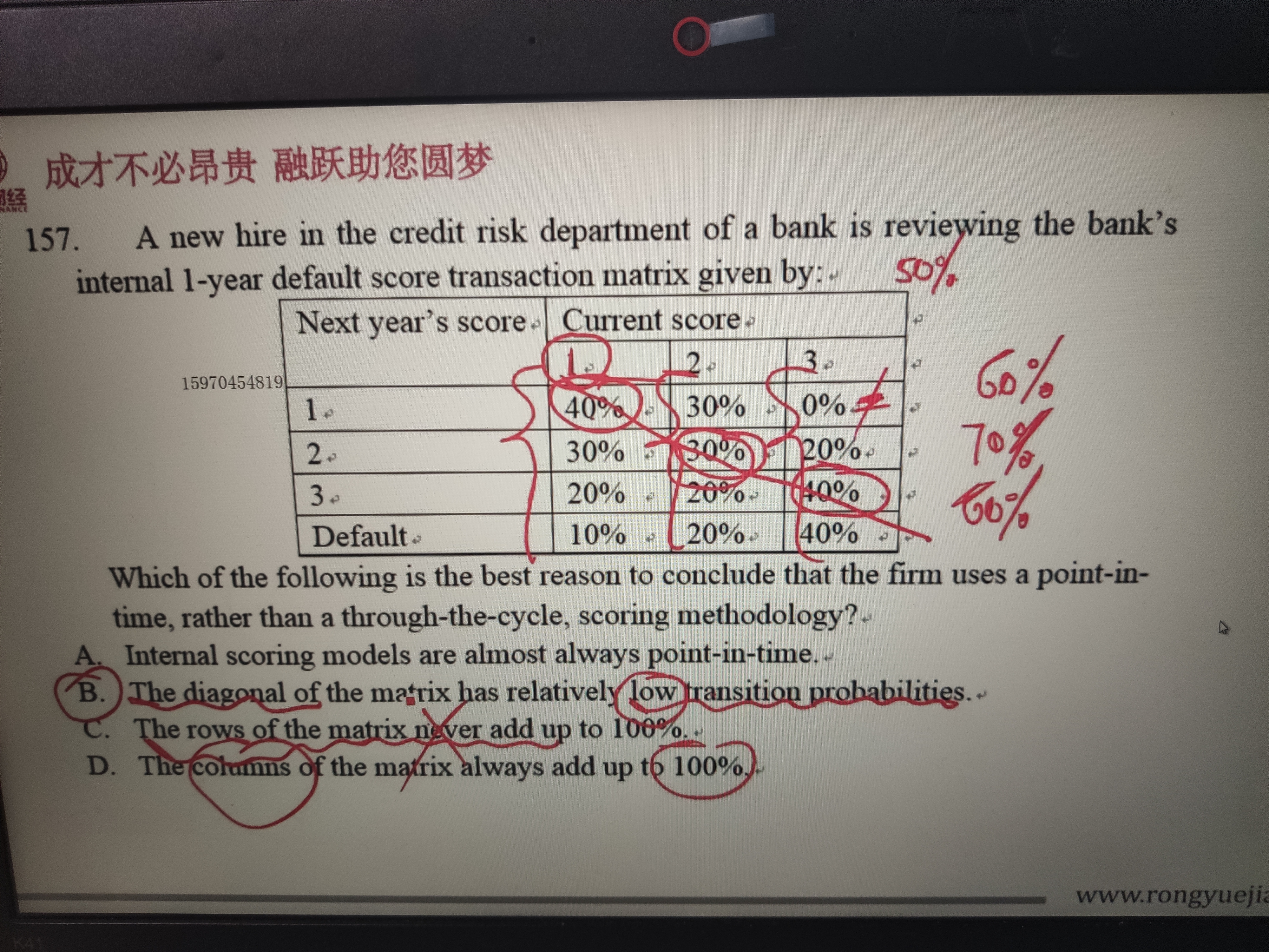 C和D只是信用迁移矩阵的性质,不是内部评级采用时点法的理由,同时A选项说的太绝对,所以选B,信用迁移矩阵对角线的概率是一年内评级状态保持不变的概率,通常这个概率是最大的。