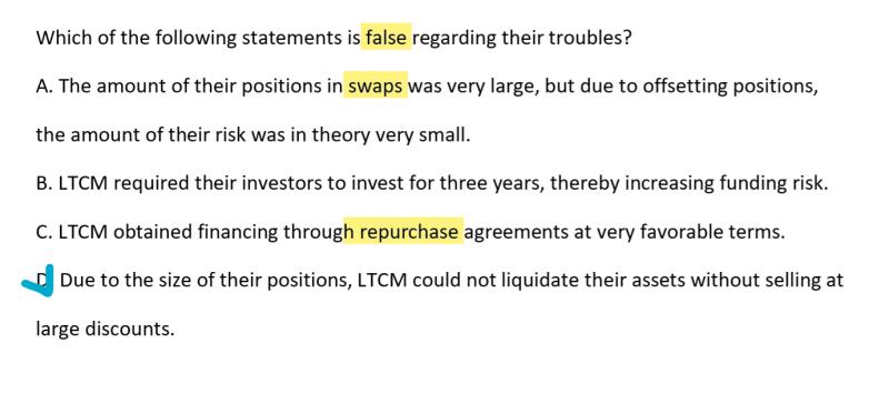 这道题主要考的是金融灾难案例中的LTCM相关问题,A选项的意思是说由于对冲头寸的存在,大量互换头寸的净头寸得以对冲,净头寸比较小,所以风险敞口比小,面临的风险也就比较小。这种对冲策略也是有利于应对危机的。B选项的意思是由于LTCM对投资期限的要求为三年,所以增加了筹资风险,因为投资者的投资期限越短,LTCM面临中间再筹资的风险就比较大。C选项的意思是LTCM通过回购协议中的有利条款获得融资这也有利于应对其面临的危机。D选项的意思是由于LTCM手中大量头寸的存在,通过卖大额头寸会进一步加剧流动性枯竭,所以这一应对危机的对策是错误的,所以答案选D