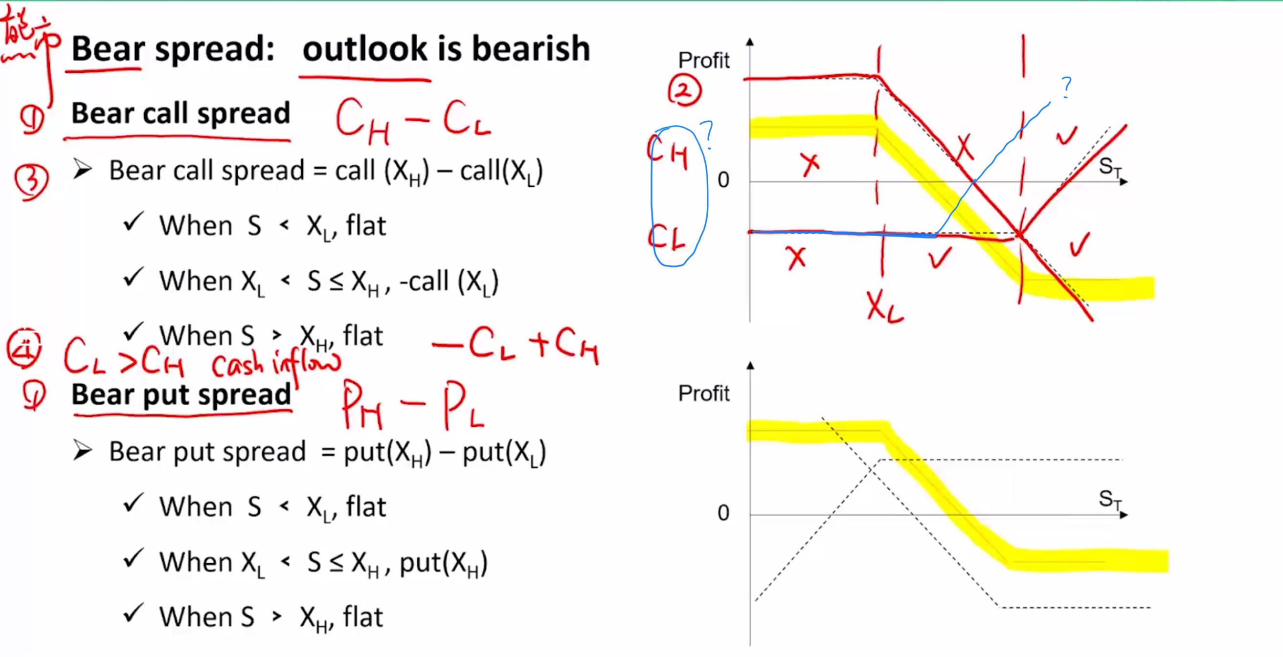同学你好,CH和CL指的是期权交易策略在某个时点上利润的高低,当SXh时,买高call行权,收入为S-Xh-Cl,卖低的成本为Xl-S+Ch,两者之和利润为Xl-Xh+Ch-Cl,小于Ch,所以CH>CL,CH在CL上面,(其中Ch表示期权费高的,Cl表示期权费低的意思,同理,Xh表示执行价格高的,Xl表示执行价格低的意思);第二个问题你画的蓝线是有可能的。