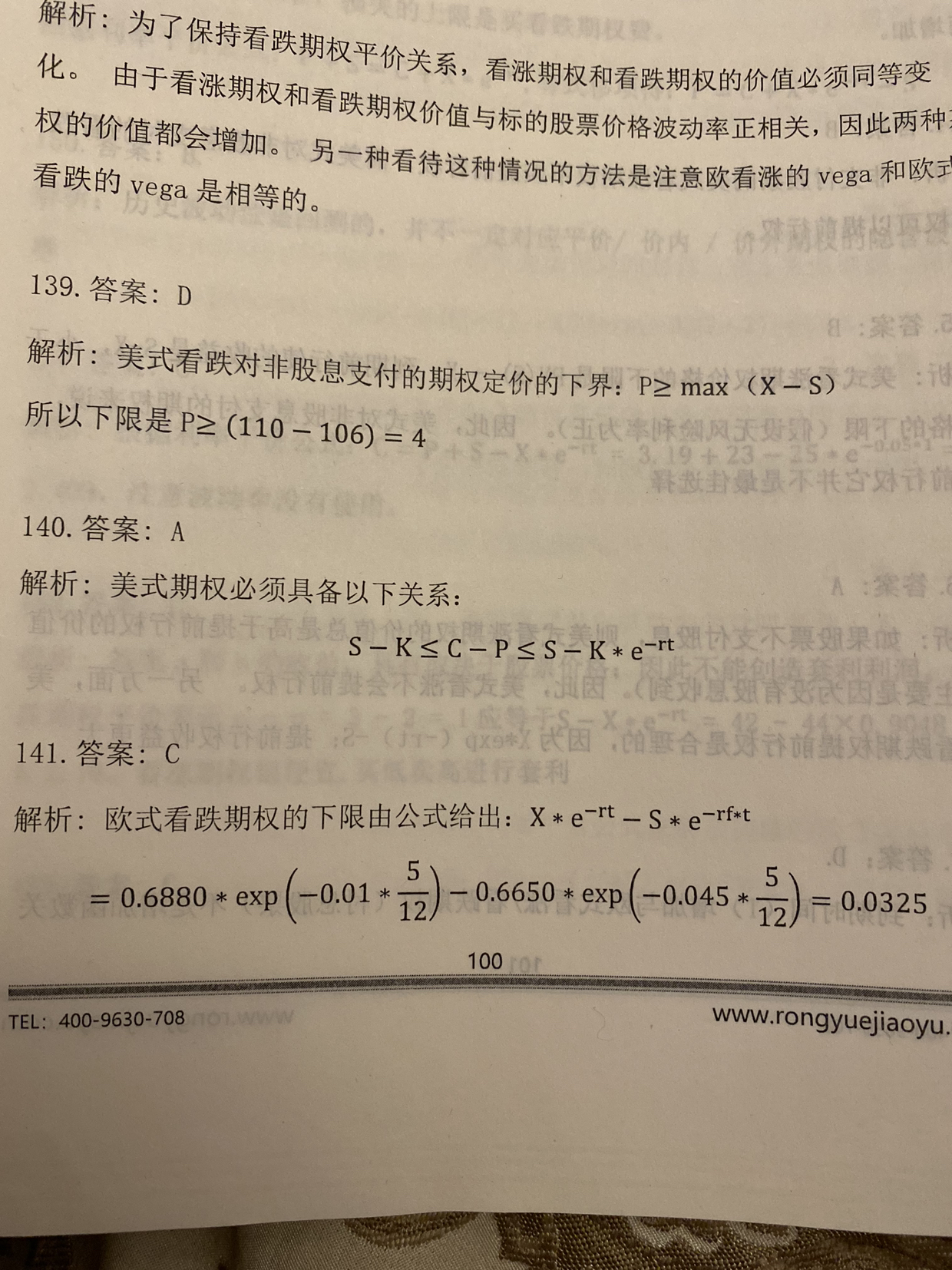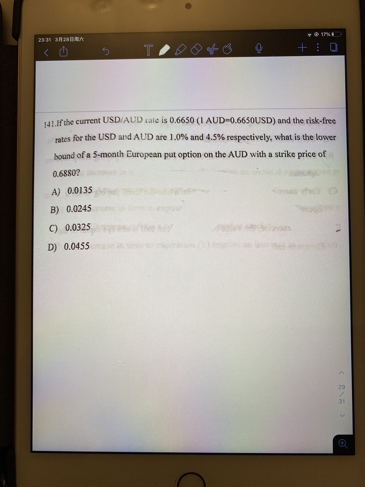 这道题考察的是欧式看跌期权的上下限问题,欧式看跌期权在零时刻上下限范围是(K*e-rt-S0,K*e-rt),这道题只问了改期权的下限,即用K*e-rt-S0计算即可,这道题的特殊性在于期权的标的资产是汇率,所以需要对S0进行进行调整(把外汇看成某种商品,货币对应的利率即为便利收益率,所以需要进行折算即e*-4.5%*5/12)