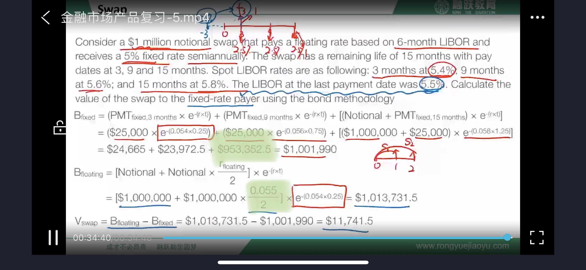 注意题意浮动端的利率是6个月期限的LIBOR,5.5%也是6个月的LIBOR,其实从给出的3、9、15期的LIBOR,也可以看出是LIBOR默认是6个月的,所以从未来最近一次付息日折到现在也就是零时刻,期限就是3个月,直接除以2就可以了。