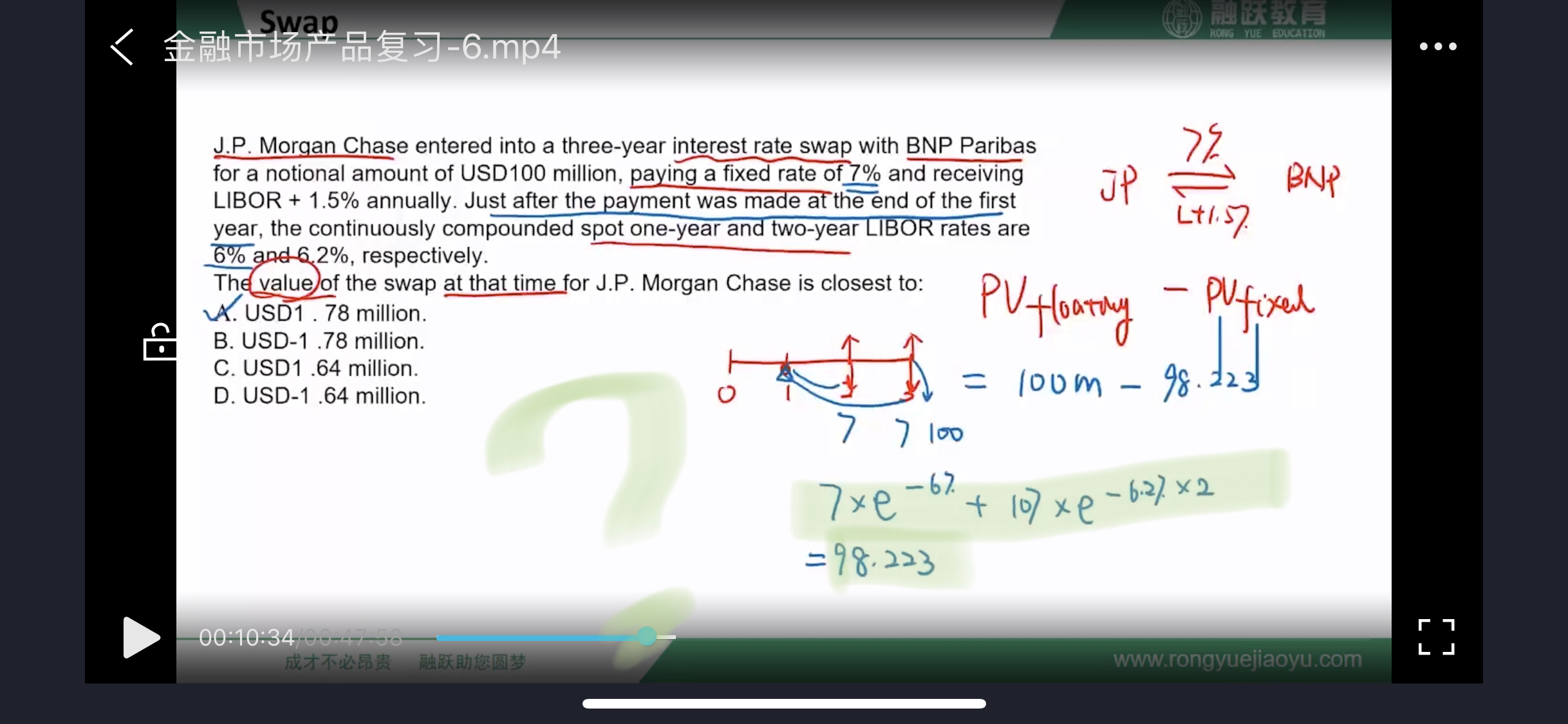 划绿线的没有错,原因是.这道题让求的互换价值时间点(at that time)是在第一年末,不是零时刻。注意理解题意。