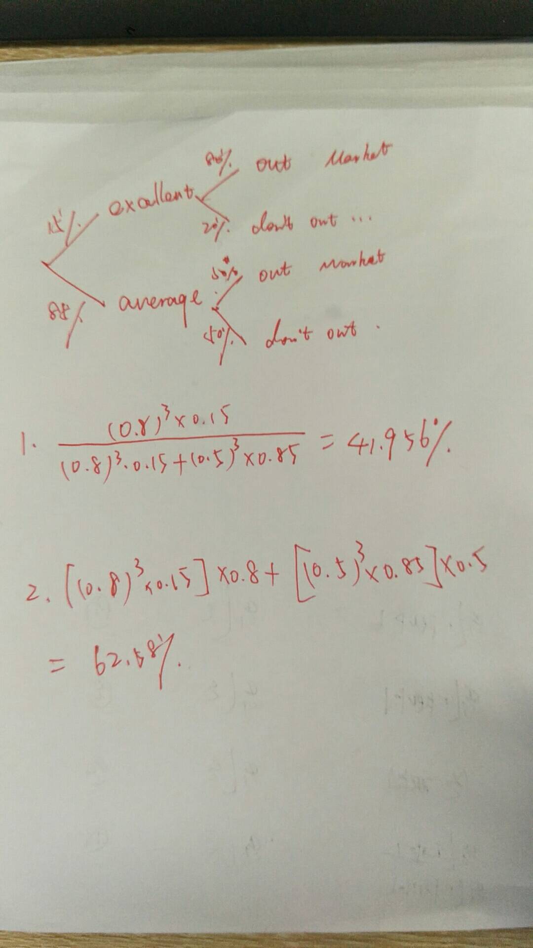因为题目有前提条件,之前三年每年都outperform market,每年打败市场或低于市场这个事情是独立的;比如说你前三年都是一个好的基金经理你最后新的一年就变成了一个水平一般的经理吗? 主要就是把树状图画出来就简单了