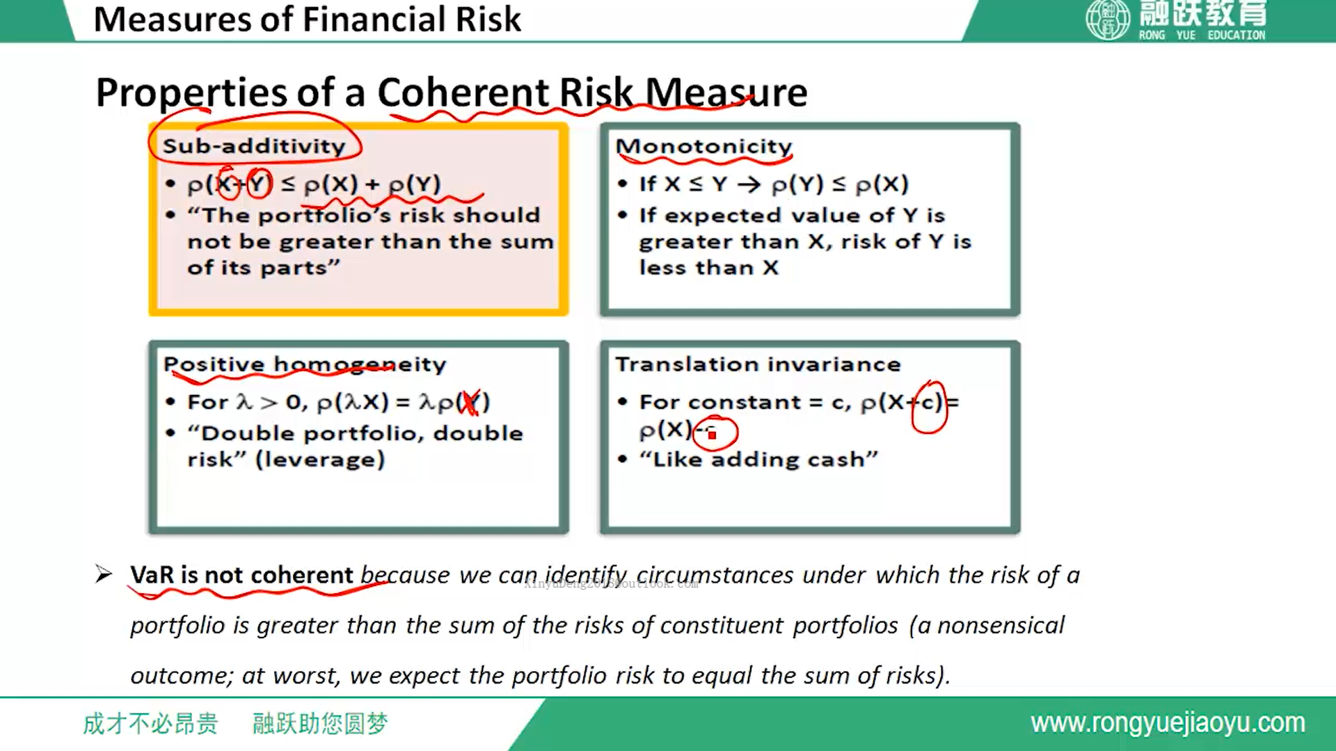 VaR的单调性指的是优质资产的风险相对较小,是站立在资产的预期回报率角度来说的,而风险越高,收益越大,是站立在市场的要求回报率角度来说的,角度不同,本质是一样的。