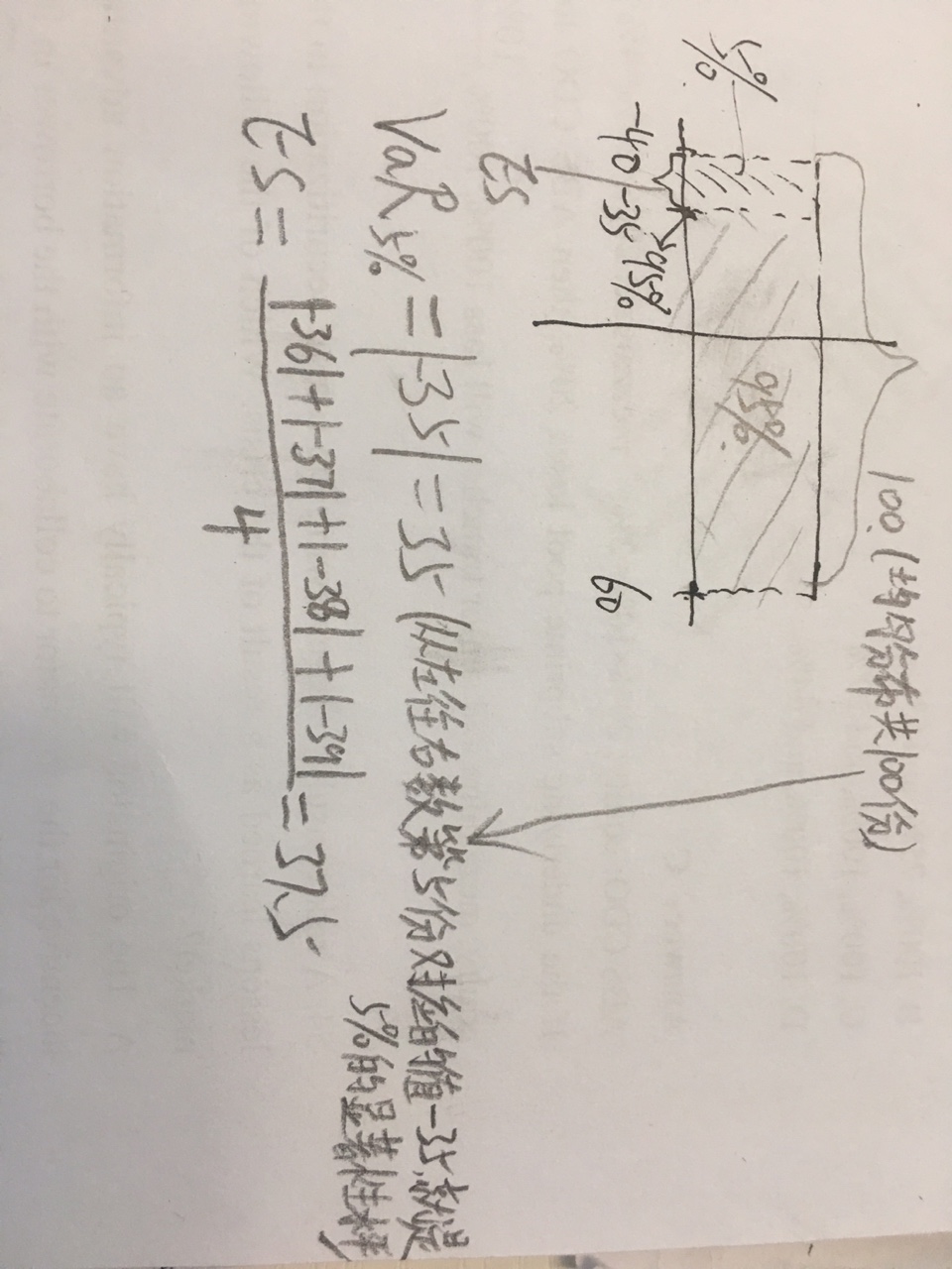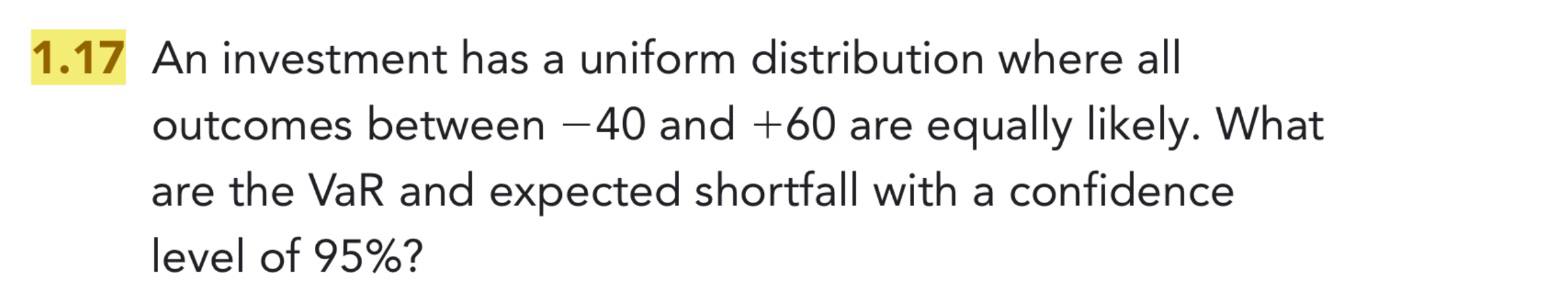 同学你好,这道题首先题目已经给出是均匀分布,那就用原始数据法,把数据区间(-40,60)分成100份,每份为1,95%的VaR对应的就是95%的显著性水平下,VaR一般是左尾,所以5%的分位点对应的数值就是-35;而根据ES的定义,ES是指超过VaR值之后的平均损失,所以就用剩下的四个值的算术平均。可参见下图