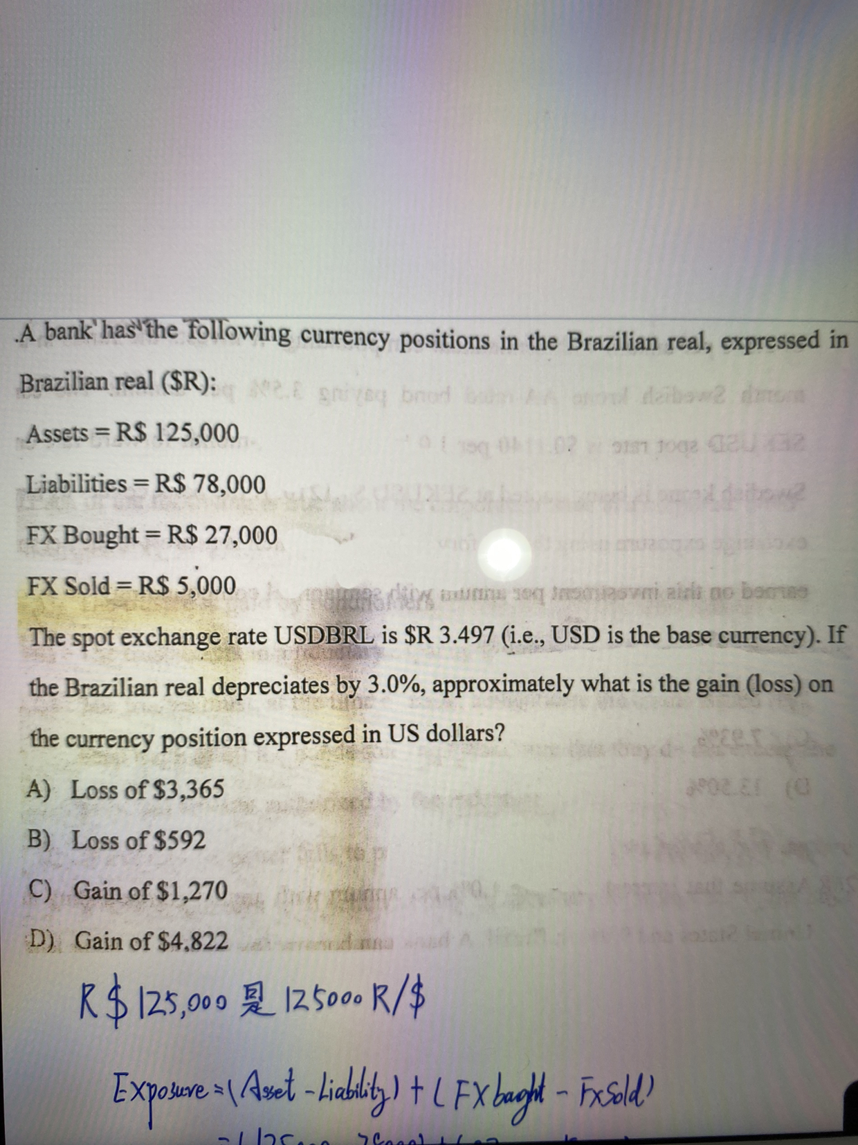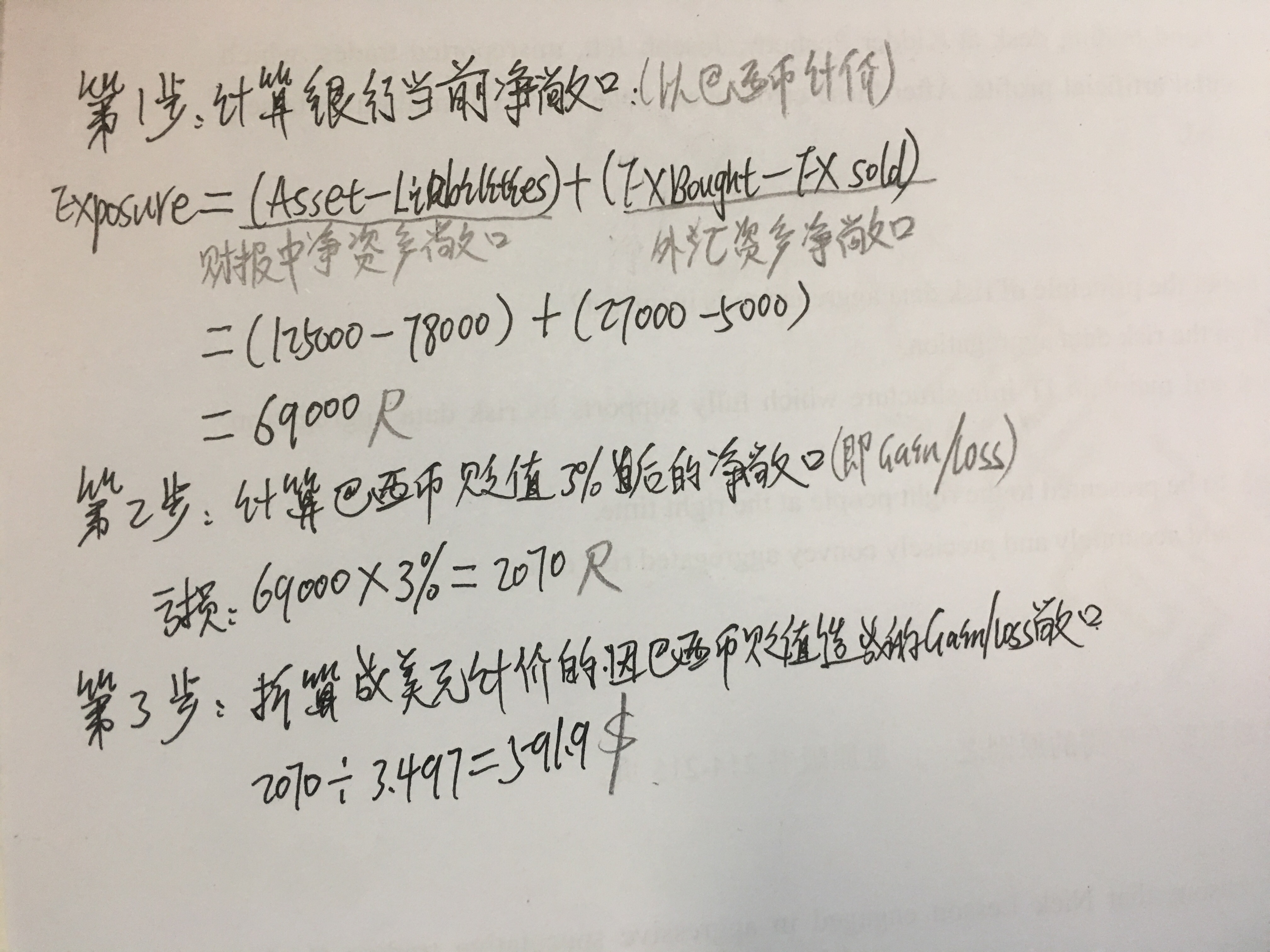 同学你好,这道题考察的是汇率变化对外汇资产敞口的影响,计算过程参考下图