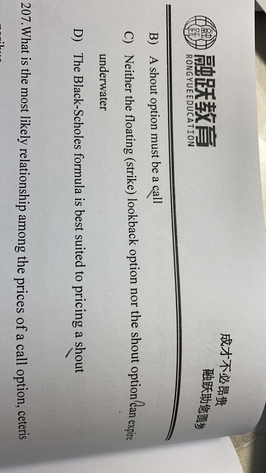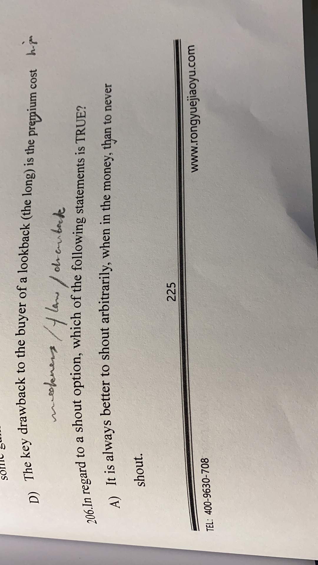 expire underwater是指使用价格(在浮动回望期权中指为存续期内标的资产价格的最大值或最小值,而在喊价期权中指的是为收益为最高的标的资产价格)低于标的资产的到期时候的价格。而根据括号里面对使用价格的定义,可知浮动回望期权和喊价期权都有可能低于标的资产到期时候的价格。所以该项中关于回望期权的说法错误。