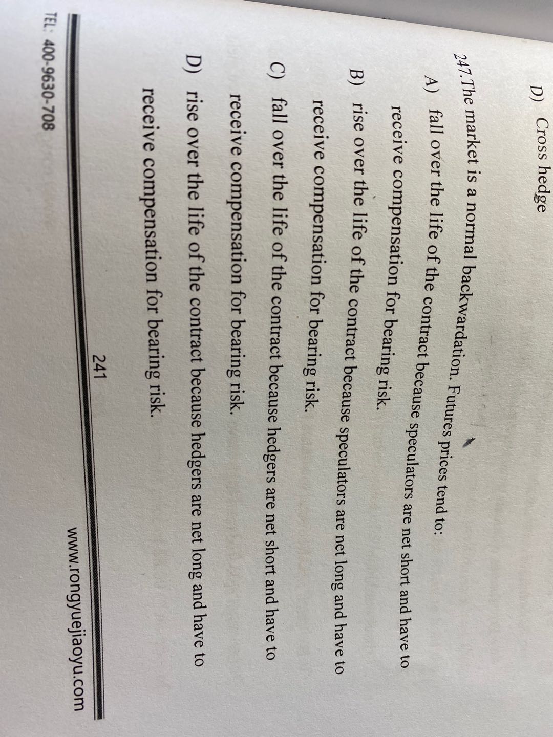 这道题目的意思是说目前市场是一个现货溢价市场,也就是期货期货贴水市场,问的是期货价格倾向于什么情况,根据AB选项的意思,问的是期货价格在剩余合约期限内的变化,以及投机者处于什么净头寸下会得到一定的风险补偿,因为投机者一般不持有现货,都是根据基差变化进行套利,所以一般情况下的投机者的净头寸都是指的期货净头寸,当期货净头寸是多头时,由于目前是期货贴水市场,所以为亏损状态,只有当未来期货期货价格上涨才能给多头以风险补偿。而CD选项指的是对冲者,因为对冲一般都是为了套期保值,手中一般都会持有一定现货,所以不存在风险补偿。