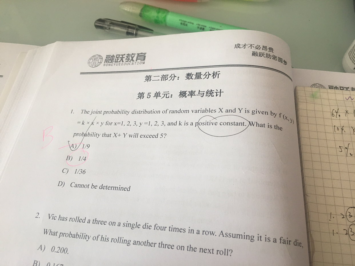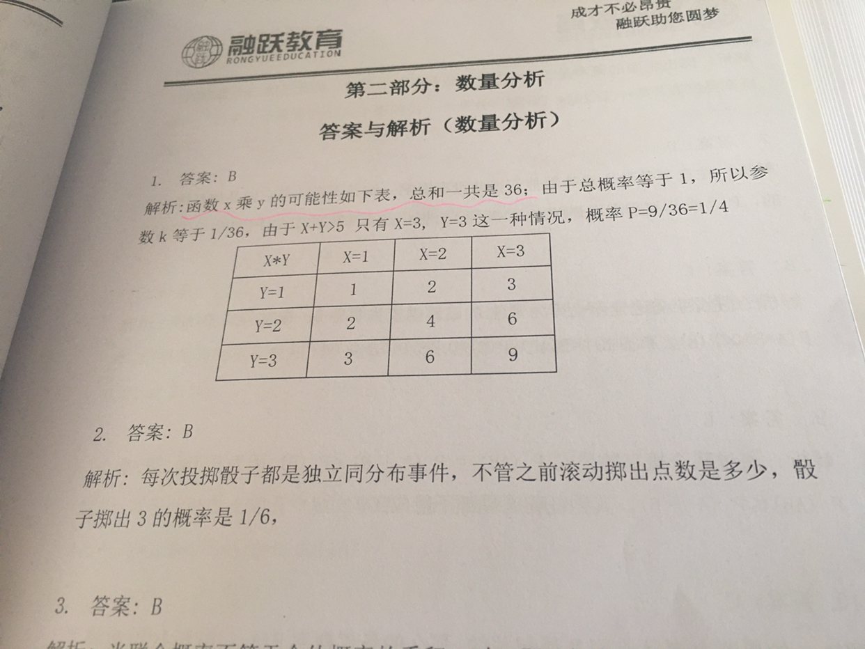 同学你好,首先,这道题要求的是X+Y>6在联合概率密度函数中函数f(X,Y)=k*X*Y中的概率,计算概率首先要知道该函数的无条件概率即分母是多少,根据答案中的概率矩阵可知,有九种可能性之和应该为1,即36k等于1,则k=1/36,而当X=3,Y=3时,f(x,y)=9k,全概率为36k,此时所求概率即为9k/36k=1/4.