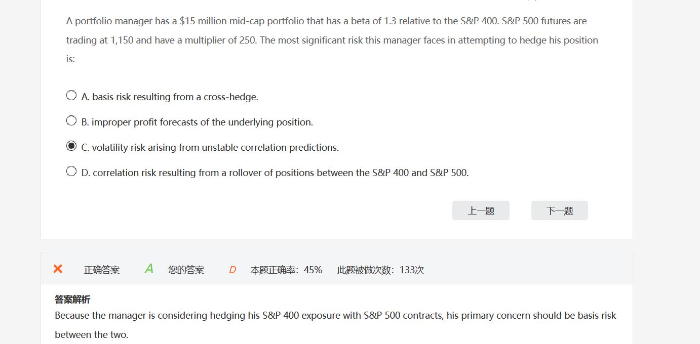 同学你好,滚仓风险指的是针对同一个期货合约,如果市场上没有一个合适的长期期货合约对手里的现货组合进行对冲,那么可以用同一个短期期货合约进行滚仓对重,而这道题题目中用标普500去对冲跟标普400有相关性的标的资产组合,就属于交叉对冲,这是面临的最大风险,即用不对标的期货合约去对冲现货资产。基差风险是期货和现货之家的价差风险,这里也是指标普500对跟标普400有相关性的现货标的资产组合之间的价差风险,没有问题。所以A对D错。