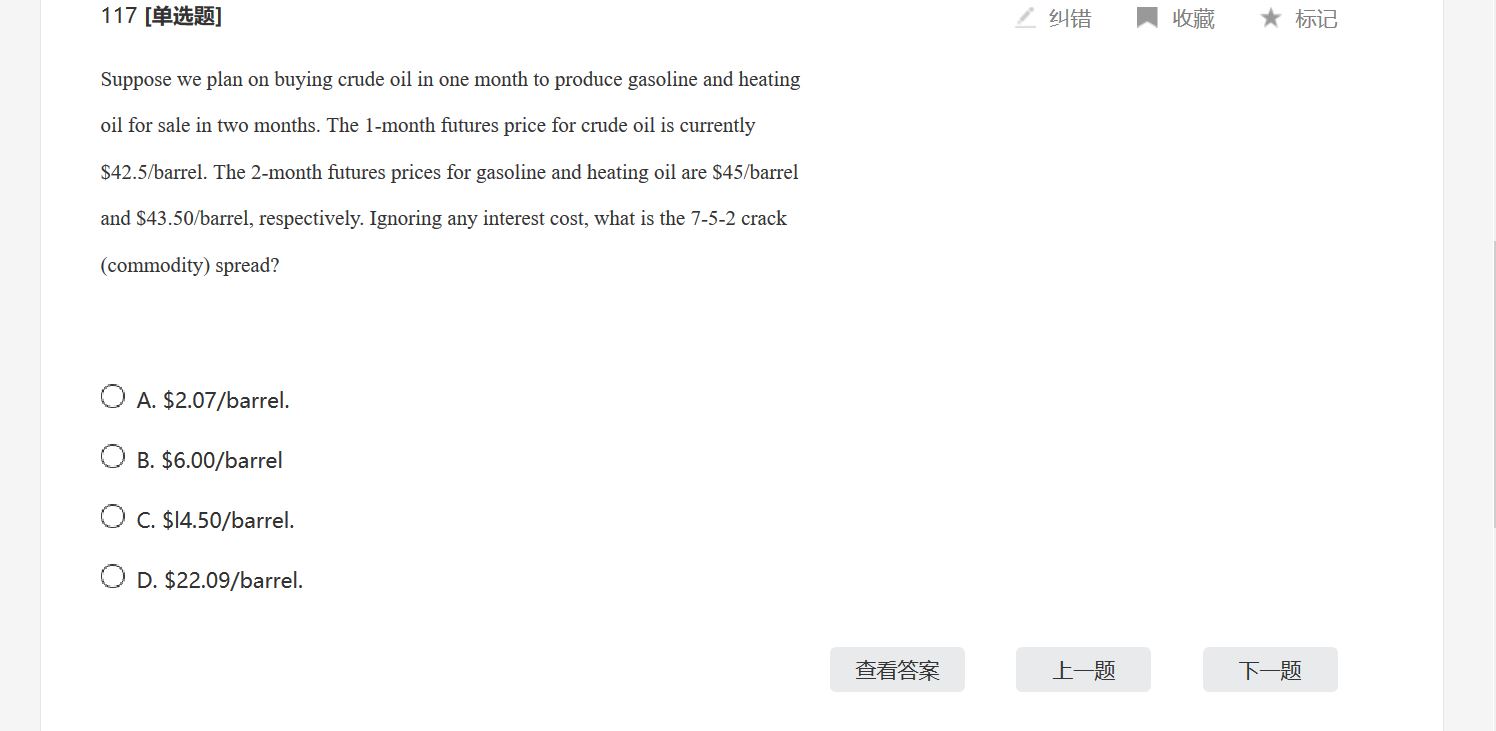 同学你好,该题考点为大众商品章节中的裂解价差(Crack Spread)这里7-5-2的意思是7加仑的原油可以提炼出5加仑的汽油和2加仑的燃油。计算公式为5*45+2*43.5-7*42.5=14.5。