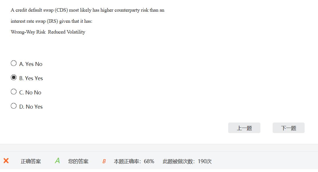 同学你好,首先说说什么叫错路风险,当违约概率和违约敞口同时上升的时候,就称为错路风险。给你举个例子。在07-08金融危机的时候,你买了A公司的债券,但是担心A公司破产导致违约,于是你向提供信用保护的B公司支付了一笔保费,你们约定当A公司发生了违约,B公司要对你进行赔付。但是当危机到来,违约概率发生上升的时候,A公司发生违约后,B公司也发生了违约,你的敞口从原本的A公司债券,变成了A公司债券加向B公司支付的保费。从这个角度看,你的风险并没有减小,反而极剧的上升了。所以有严重的错路风险,而且波动率上升。但是对于IRS,首先不涉及本金的交换,而且相比CDS,每期仅交换利息,交换的数额较小。所以CDS有更大的对手方风险,错路风险,同时会提高波动率。